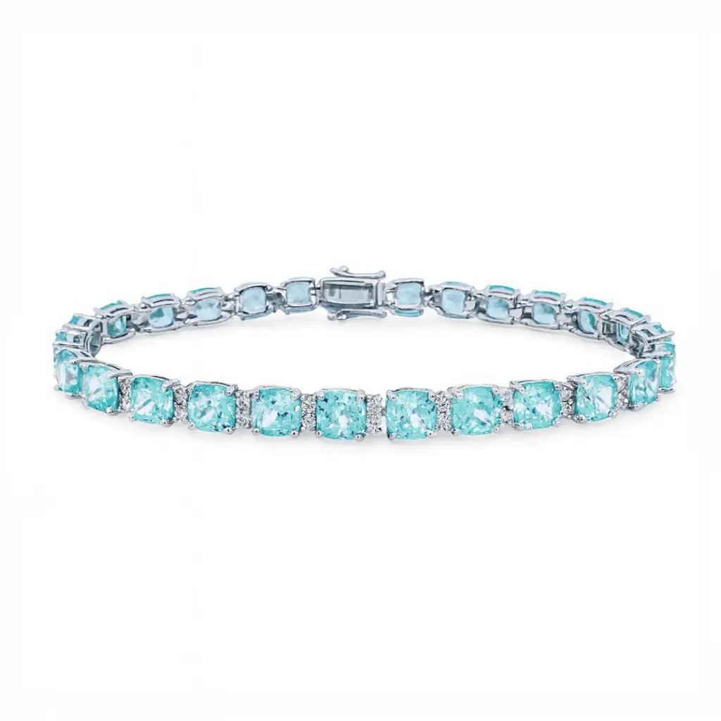 Zilveren armband met aquamarijnkleurige cushion zirkonia stenen