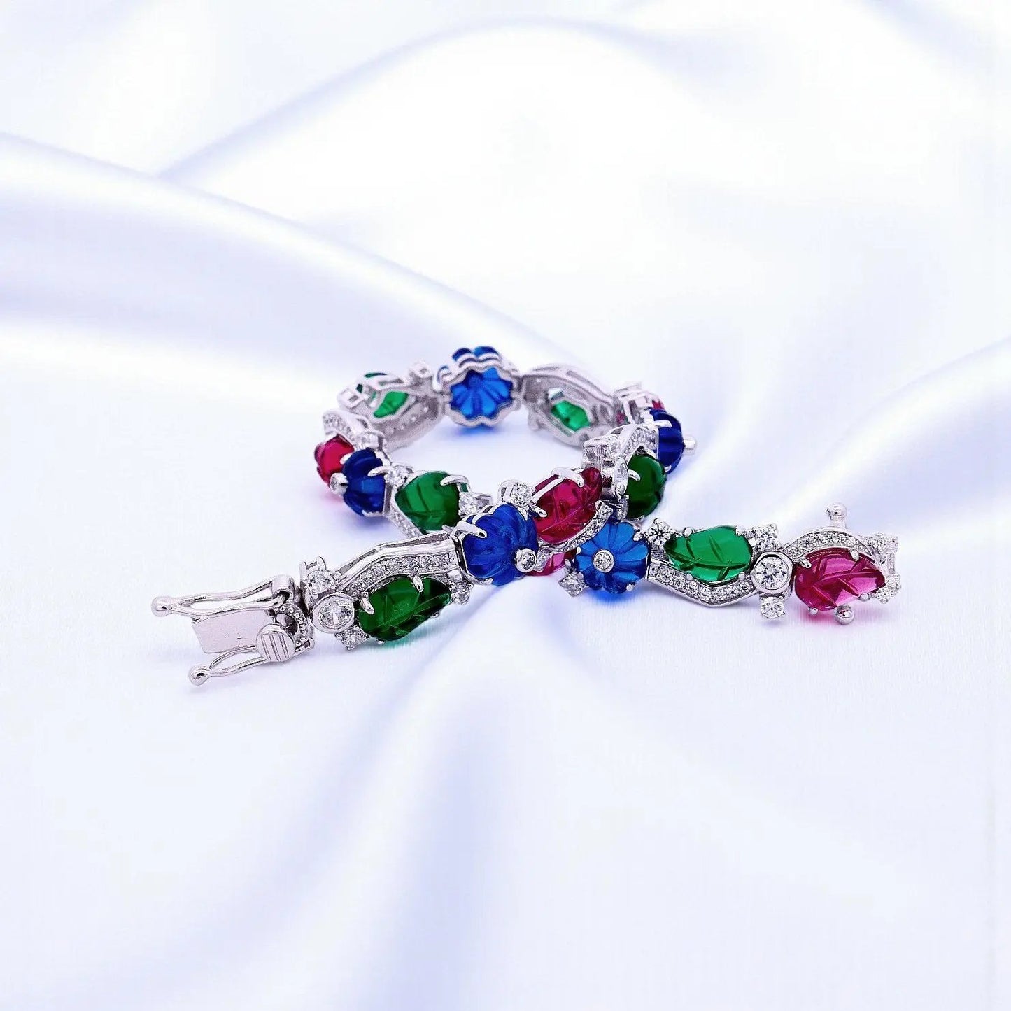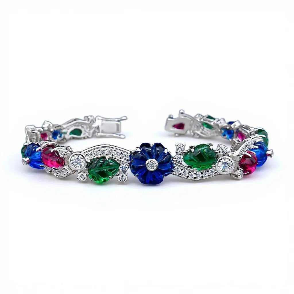 Deze armband is vervaardigd van 925 gerhodineerd zilver en is bezet met 6 groene en 5 roze bladvormig geslepen zirkonia's, 5 blauwe bloemvormig geslepen zirkonia's en met vele briljant geslepen witte zirkonia stenen. Aan het uiteinde een bakslot met aan weerszijden elk een veiligheidsachtje. de breedte van de armband is 1 cm., de lengte 16.8 cm. Totaal gewicht 17.7 gram.