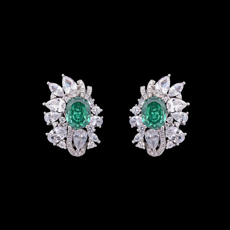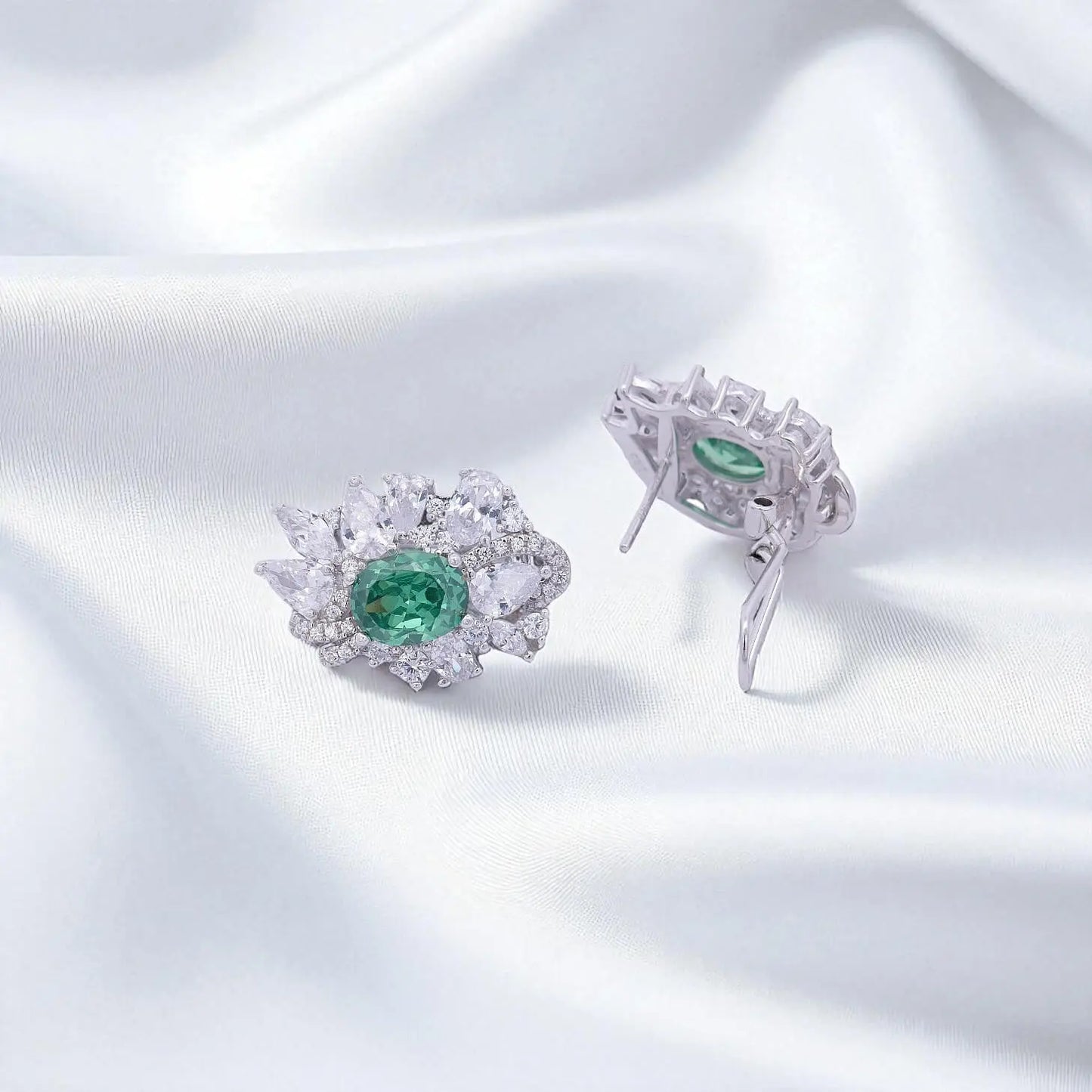 Deze cluster oorbellen zijn vervaardigd van 925 zilver en zijn bezet met ovaal geslepen groene zirkonia's en met peervormig, ovaal en rond geslepen gefacetteerde witte zirkonia's. Oorbellen zijn voorzien van stiften en clipsen. Afmeting 2.5 x 1.7 cm., totaal gewicht 10 gram.