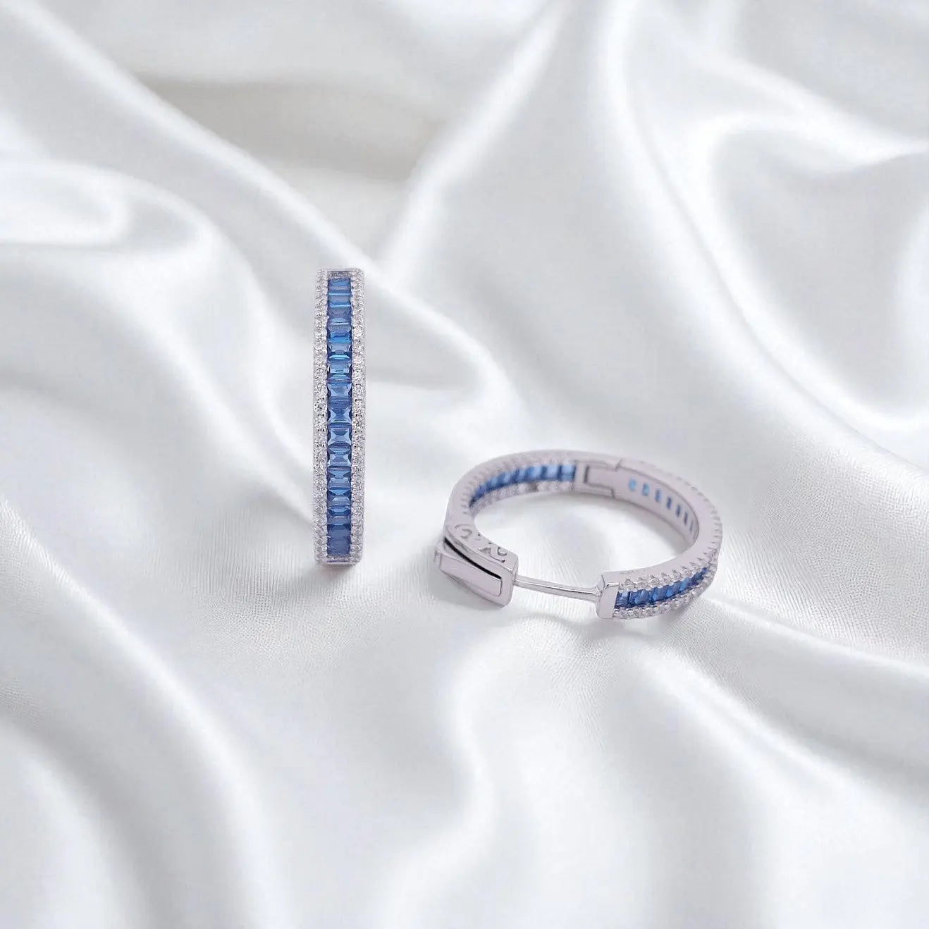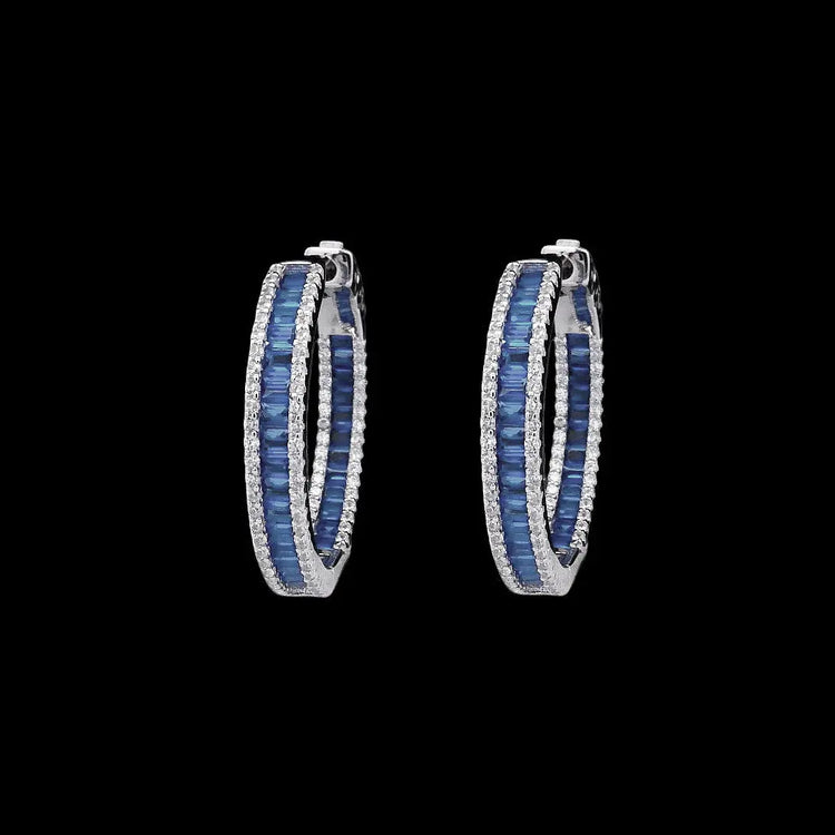 Deze creolen met scharnier zijn vervaardigd van 925 zilver en zijn bezet met baquette geslepen blauwe en rond geslepen gefacetteerde witte zirkonia's. Doorsnede 2.4 cm., breedte 0.4 cm., totaal gewicht 6.7 gram.