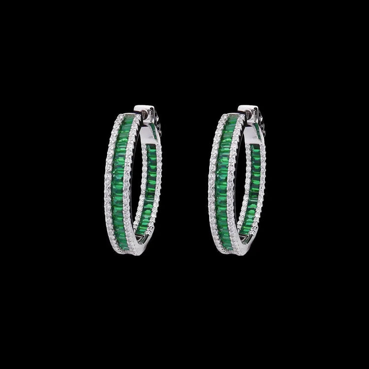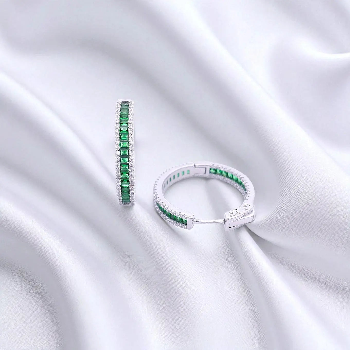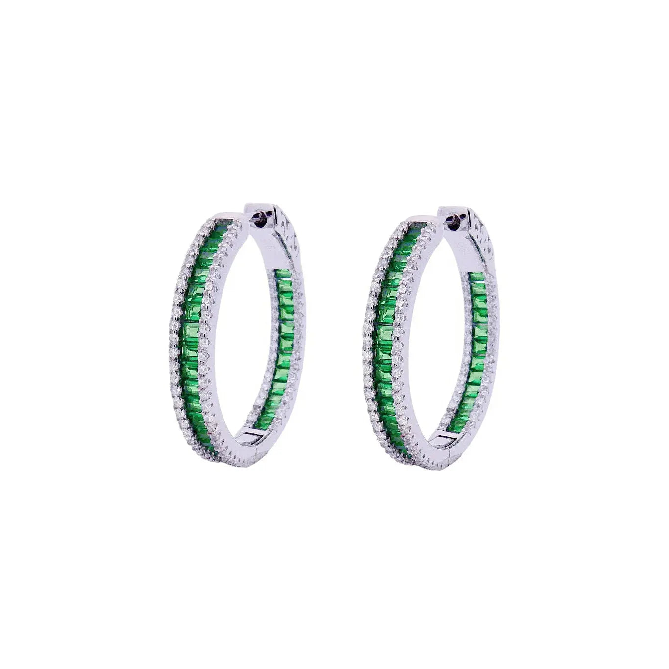 Deze creolen met scharnier zijn vervaardigd van 925 zilver en zijn bezet met baquette geslepen groene en rond geslepen gefacetteerde witte zirkonia's. Doorsnede 2.4 cm., breedte 0.4 cm., totaal gewicht 6.7 gram.