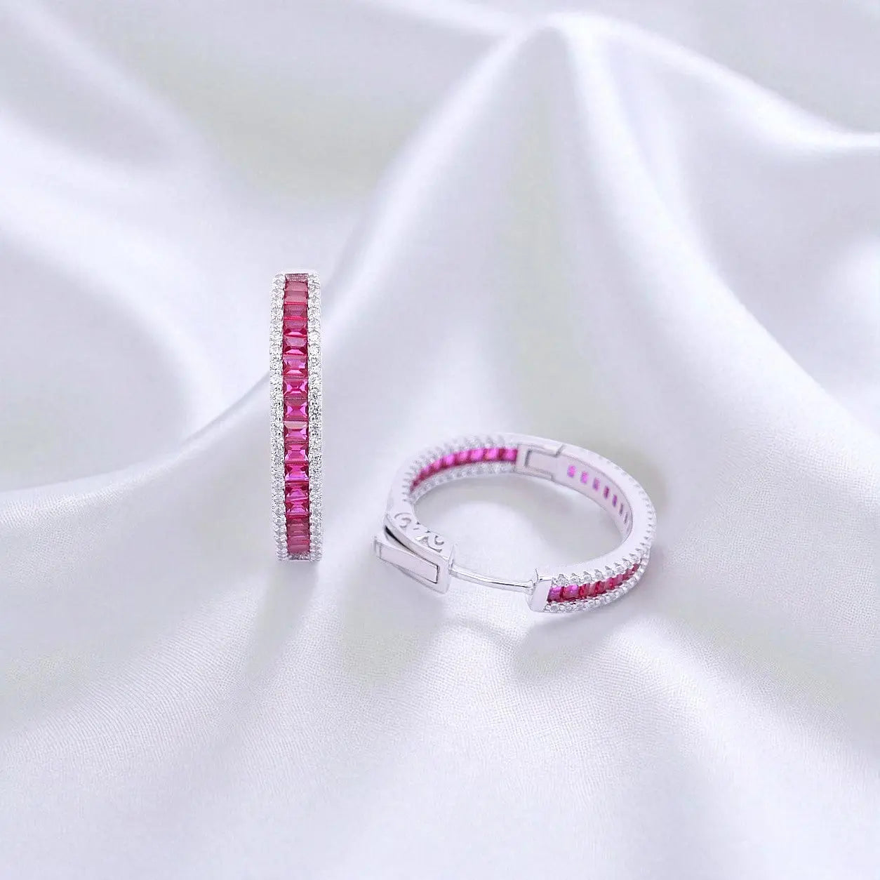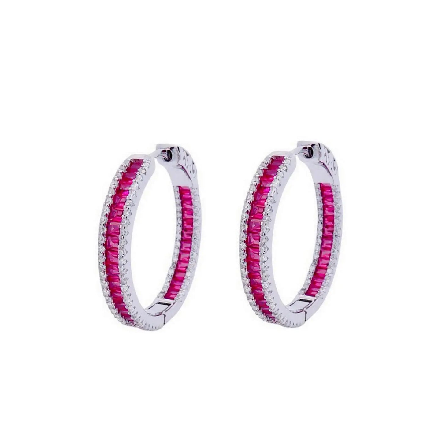 Deze creolen met scharnier zijn vervaardigd van 925 zilver en zijn bezet met baquette geslepen rode en rond geslepen gefacetteerde witte zirkonia's. Doorsnede 2.4 cm., breedte 0.4 cm., totaal gewicht 6.7 gram.