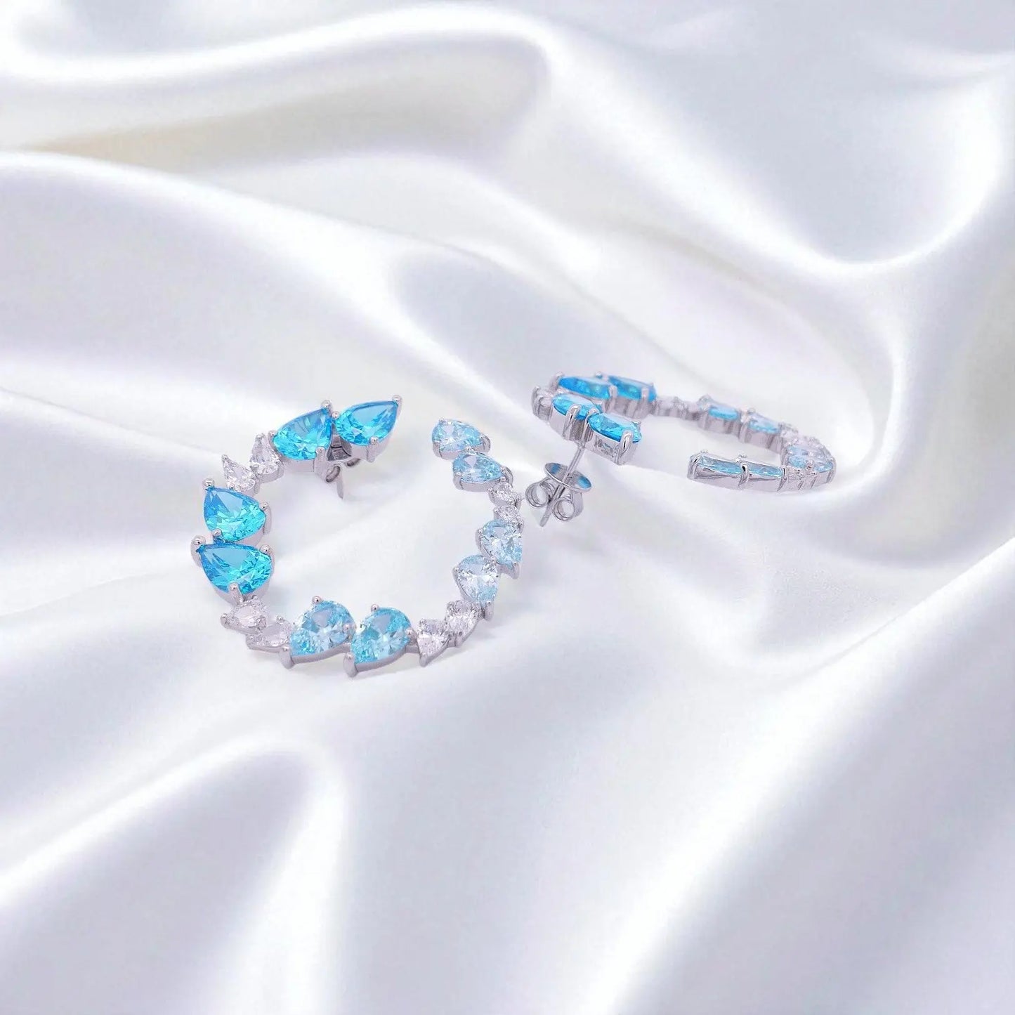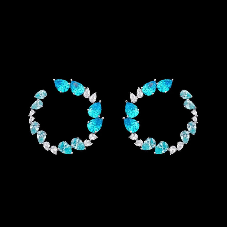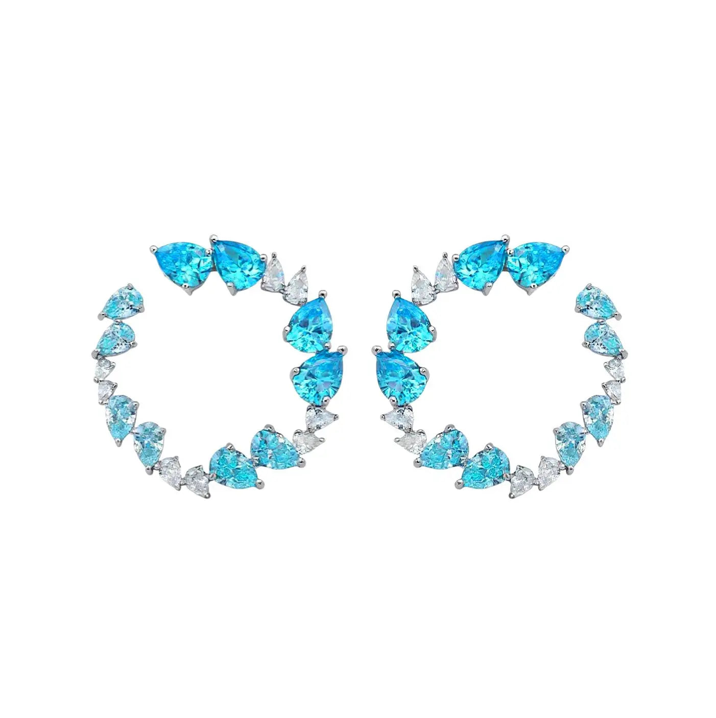 Deze fantasie cirkel oorbellen zijn vervaardigd van 925 zilver en zijn bezet met peervormig geslepen turquoisekleurige en lichtblauwe zirkonia's en met peervormig geslepen gefacetteerde witte zirkonia's. Afmeting 3.4 x 3.7 cm., totaal gewicht 14.7 gram.