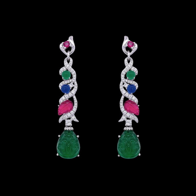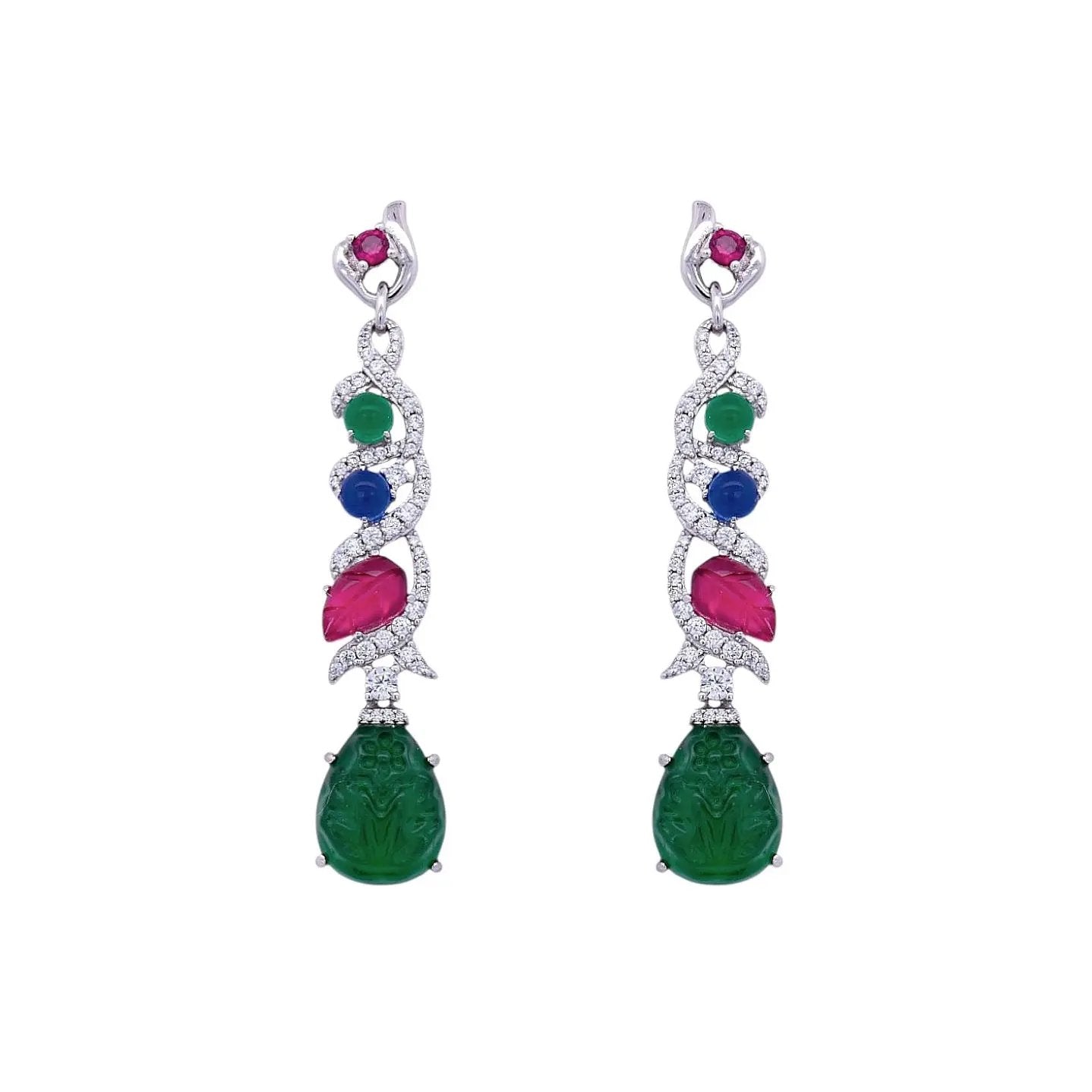Deze oorbellen zijn vervaardigd van gerhodineerd 925 zilver en zijn bezet meet roze bladvormig geslepen, groene en blauwe cabochon geslepen, peervormig geslepen groene imitatie edelstenen en met witte briljant geslepen zirkonia's. Afmering 5.3 x 1 cm., totaal gewicht 10 gram.