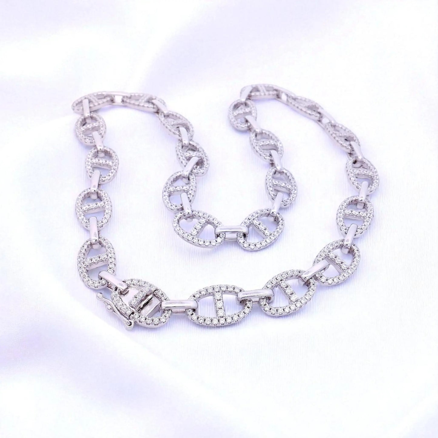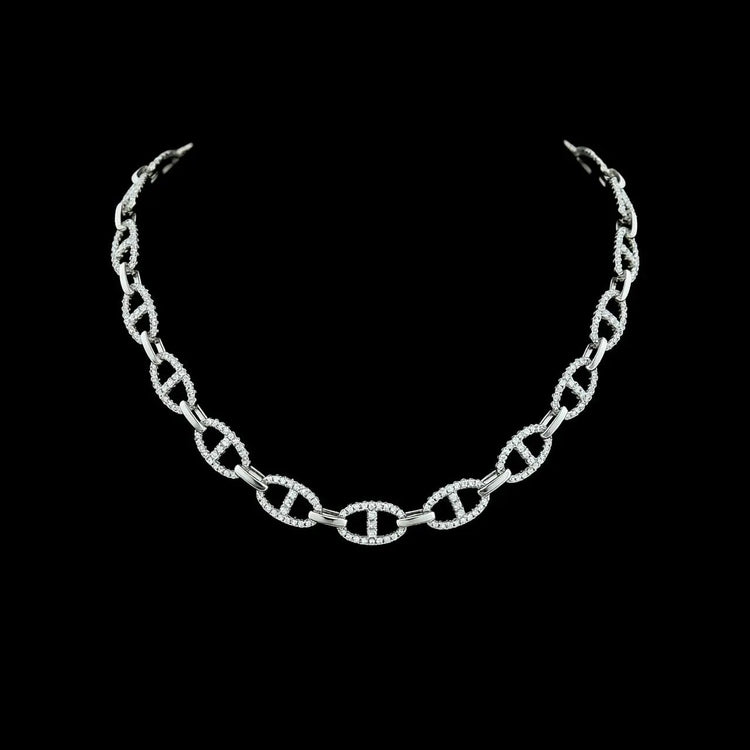 Deze fantasie open schakel collier is vervaardigd van gerhodineerd 925 zilver en is bezet met briljant geslepen zirkonia stenen. Aan het uiteinde een bakslot met een veiligheidsachtje. De breede is 9 mm., de lengte is 41 cm., totaal gewicht is 33 gram.