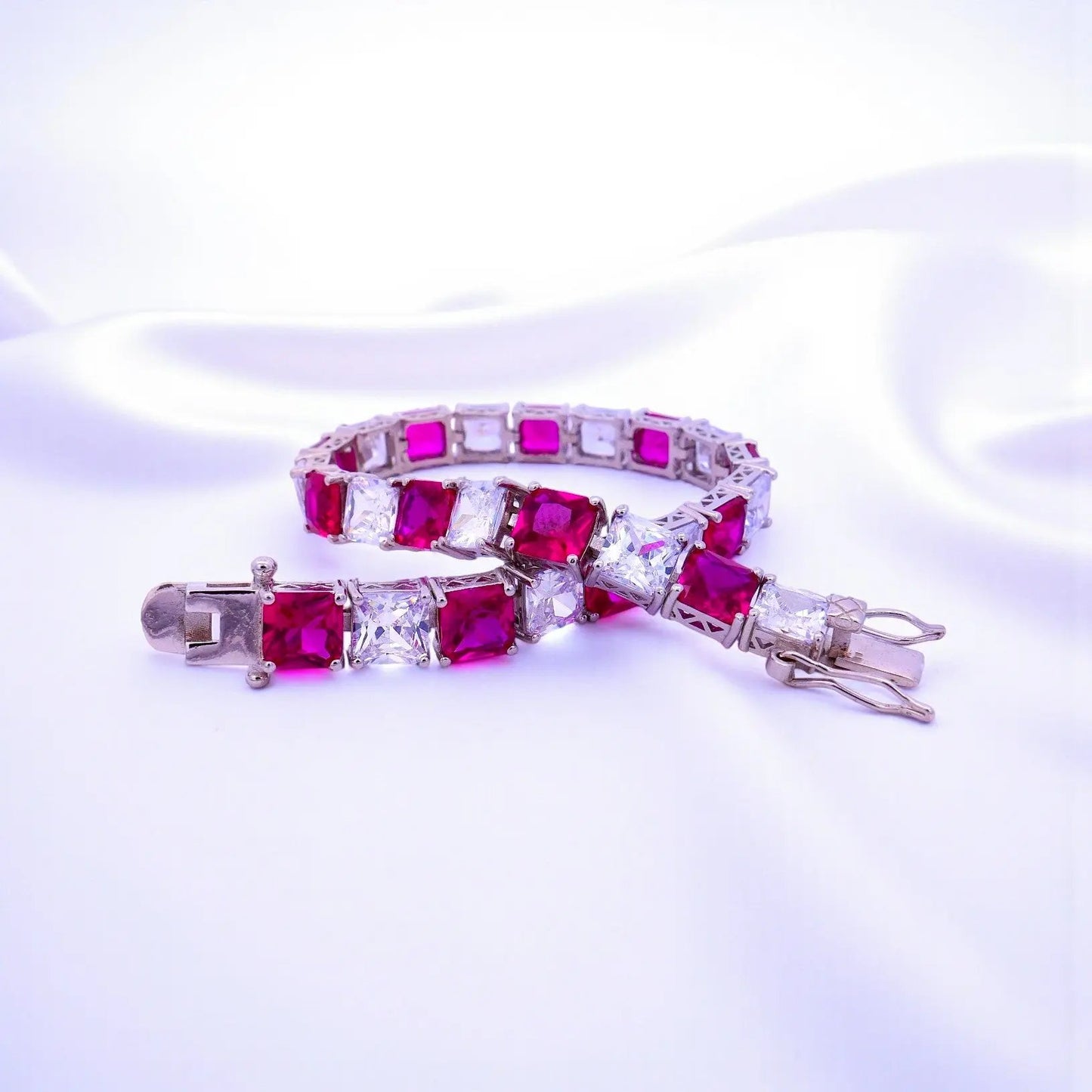 Deze luxe armband is vervaardigd van 925 gerhodineerd zilver en is bezet met 13 rood-roze geslepen zirkonia's en met 13 witte prinses geslepen zirkonia stenen. Aan het uiteinde een baklslot met aan weerskanten een veiligheidsachtje. De breedte van de armband is 7 mm., de lengte 18.5 cm. Totaal gewicht 19,6 gram.