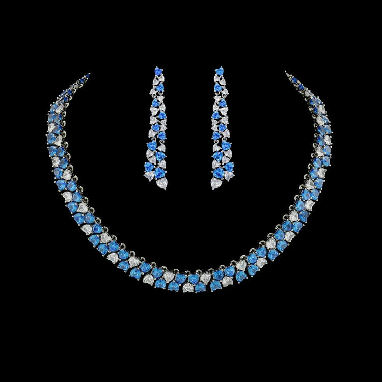Zilverkleurige collier en oorbellen met blauwe hartvormige zirkonia stenen