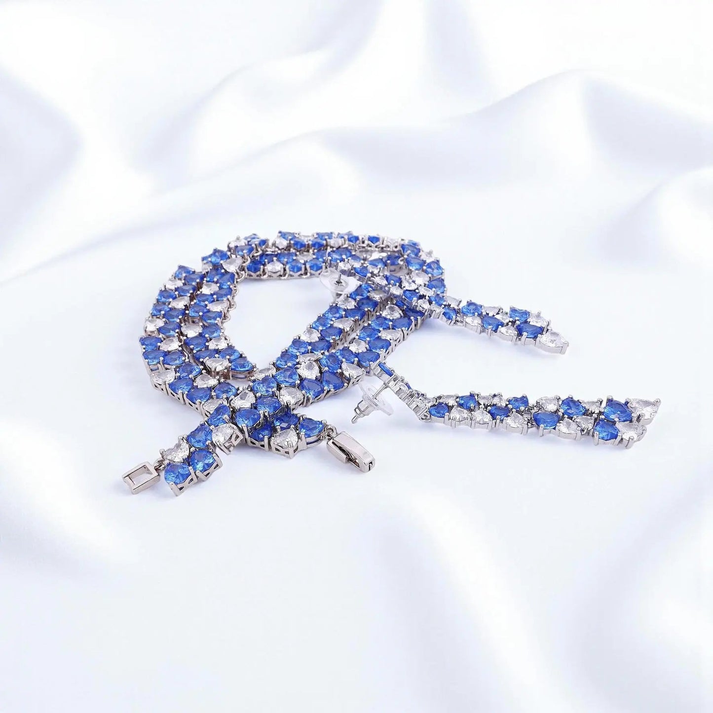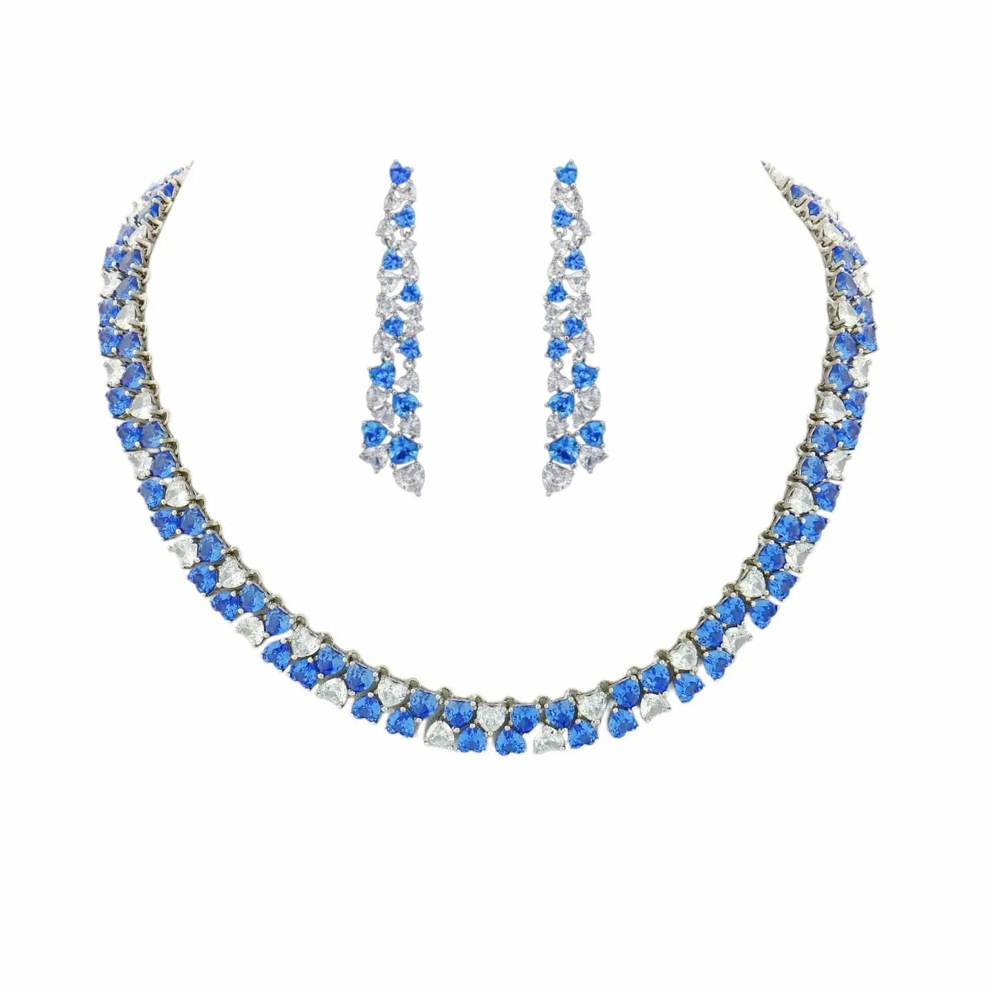 Deze zilverkleurige set bestaat uit een collier en oorbellen, bezet met hartvormig geslepen blauwe en witte zirkonia’s. De lengte van het collier is 41.5 cm, de breedte is 1.1 cm., en het gewicht is 50 gram. De oorbellen hebben de afmeting van 6.5 x 1.3 cm en hebben een totaal gewicht van 12.6 gram.