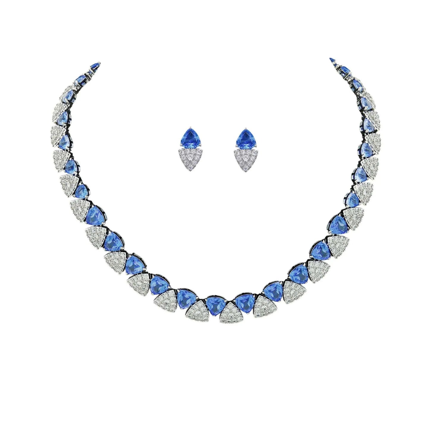 Deze zilverkleurige set bestaat uit een collier en oorbellen, bezet met trilliant geslepen, gefacetteerde blauwe zirkonia’s en pavé bezet met witte, gefacetteerde zirkonia’s. De lengte van het collier is 43 cm, de breedte 1,2 cm en het gewicht 66,6 gram. De oorbellen hebben de afmeting van 1,9 × 1 cm en hebben een totaal gewicht van 4,3 gram.