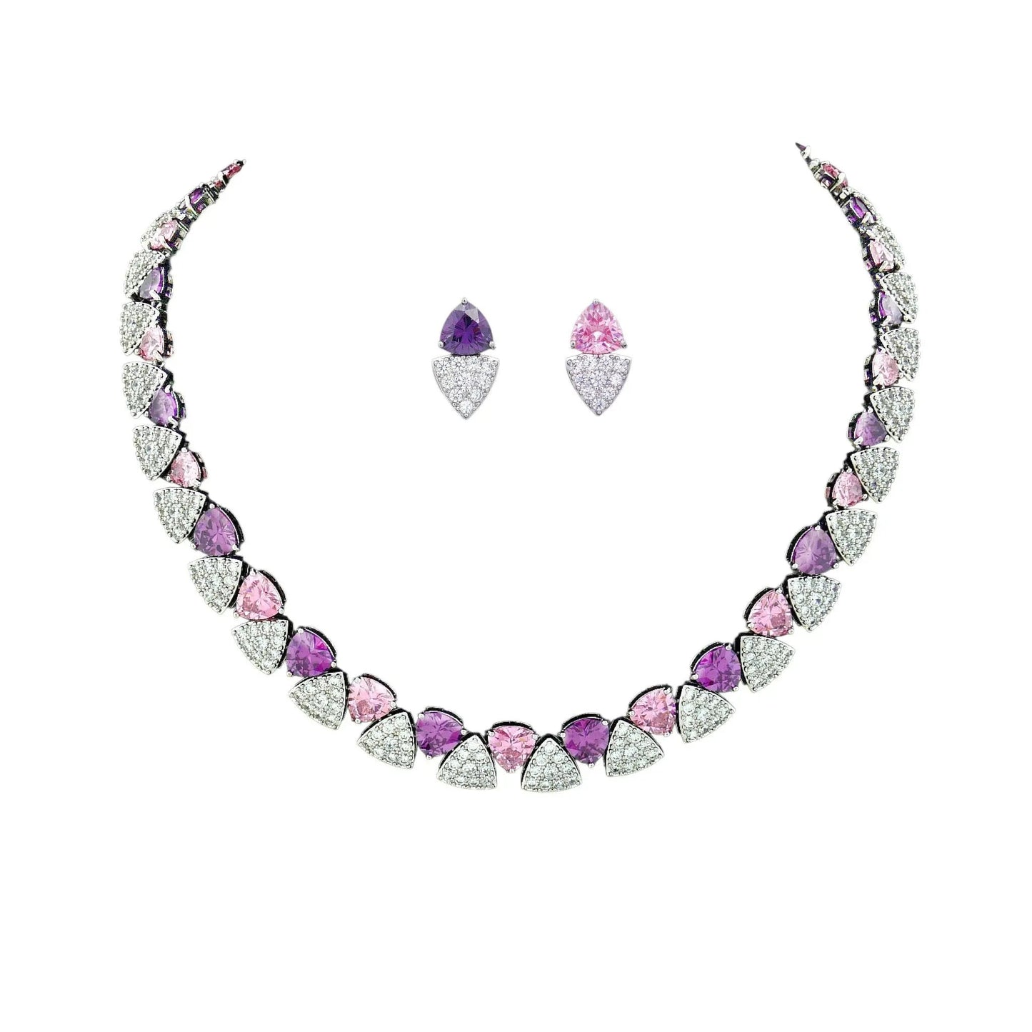 Deze zilverkleurige set bestaat uit een collier en oorbellen, bezet met trilliant geslepen, gefacetteerde paarse en roze zirkonia’s en pavé bezet met witte, gefacetteerde zirkonia’s. De lengte van het collier is 43 cm, de breedte 1,2 cm en het gewicht 66,6 gram. De oorbellen hebben de afmeting van 1,9 × 1 cm en hebben een totaal gewicht van 4,3 gram.