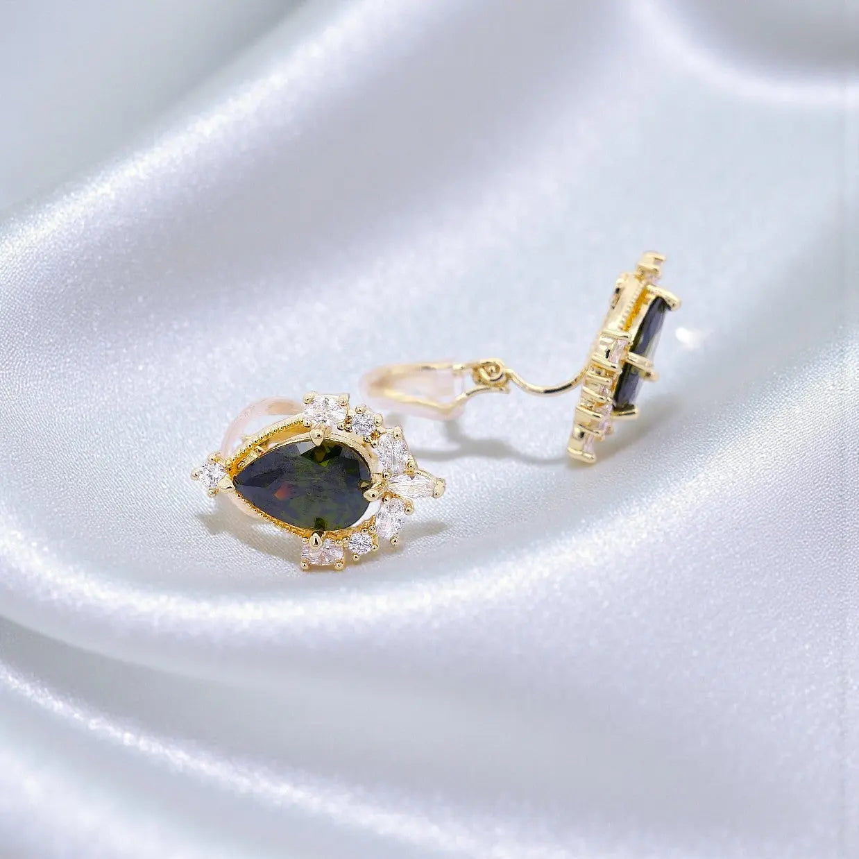 Goudkleurige fantasie oorbellen met clipsen en olijfgroene zirkonia stenen