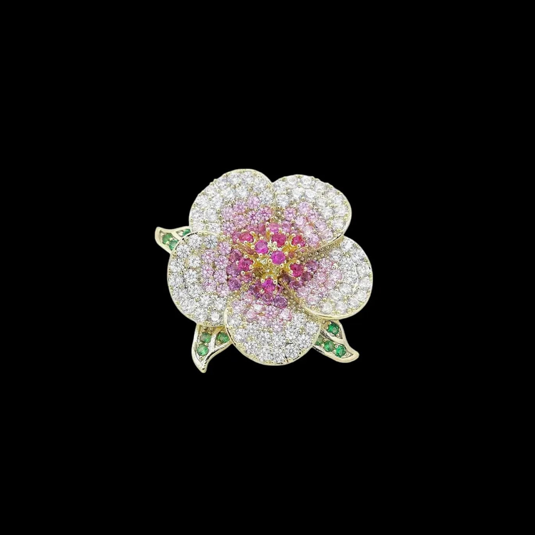Goudkleurige sakura broche met mulricolor zirkonia stenen