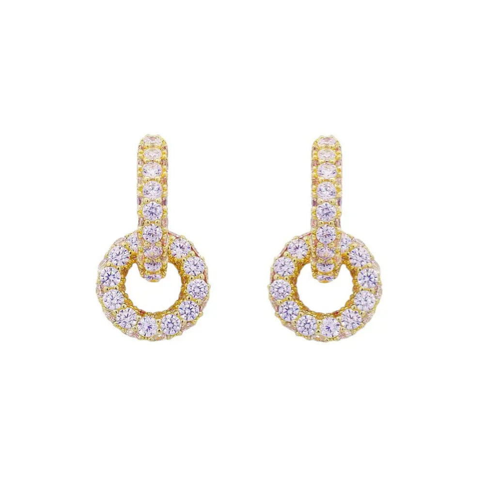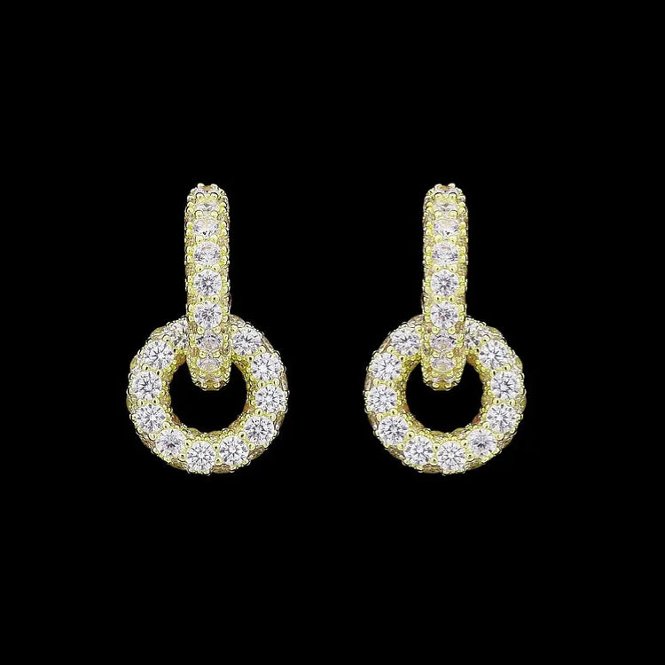 Deze goudkleurige oorbellen zijn vervaardigd van messing en bestaan uit creolen bezet met gefacetteerde zirkonia's waaraan afneembaar te dragen cirkelvormige ornamenten bezet met zirkonia's. Afmeting 2.5 x 1.4 cm., totaal gewicht 7 gram.