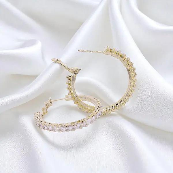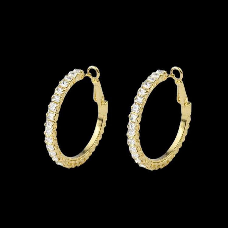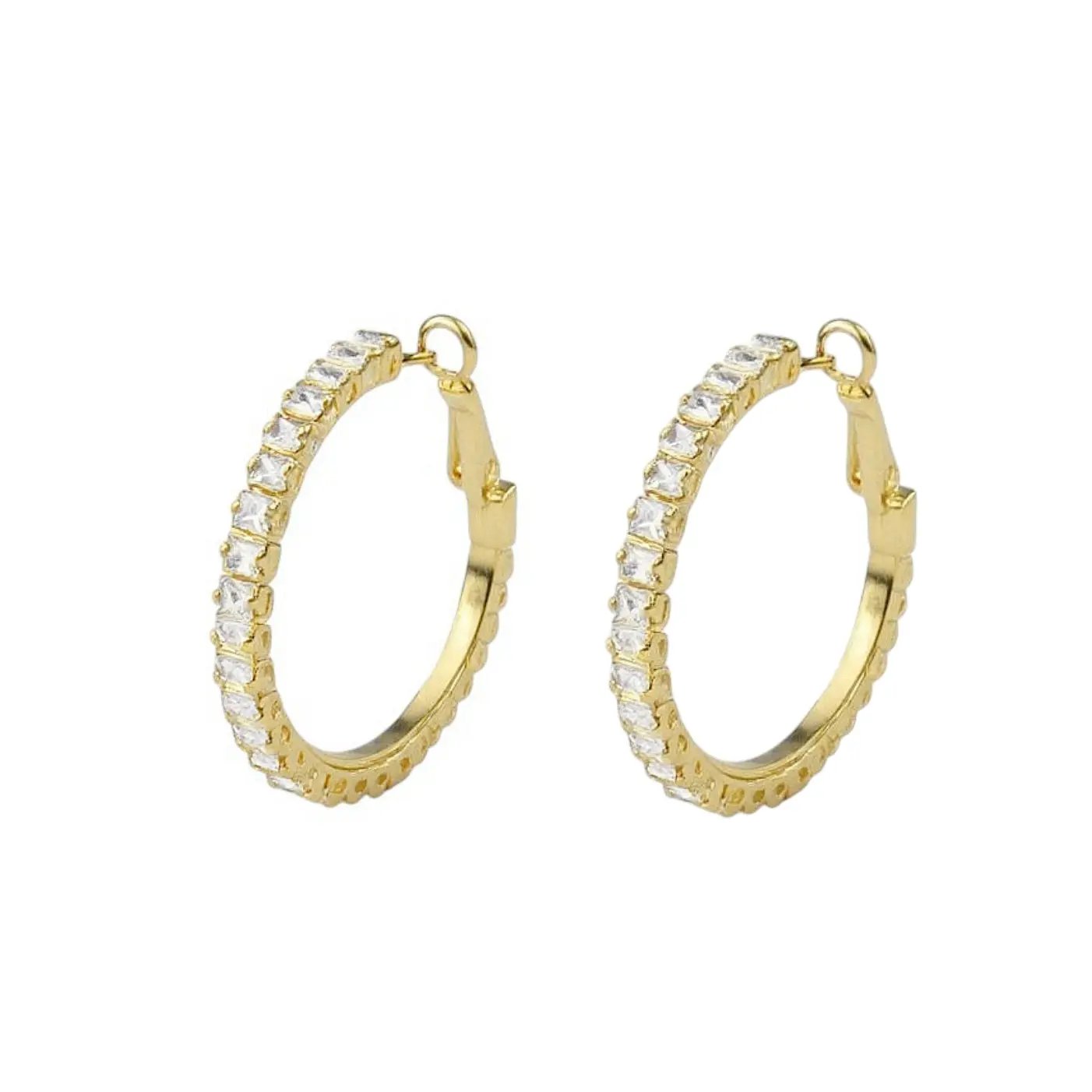 Deze goudkleurige creolen zijn rondom bezet met gefacetteerde zirkonia's. De stiften zijn vervaardigd van 925 zilver. De doorsnede 3.3 cm., breedte 3 mm., totaal gewicht 6.3 gram.