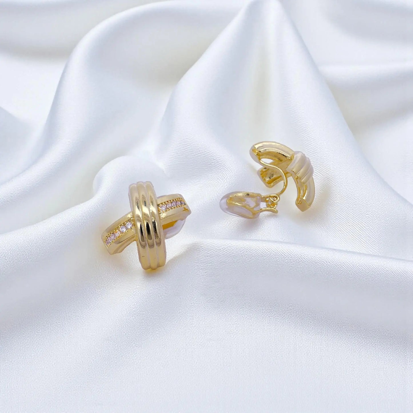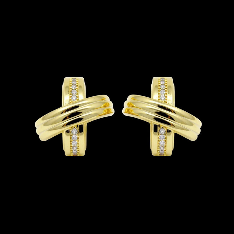 Goudkleurige cross design oorbellen met clipsen en zirkonia stenen