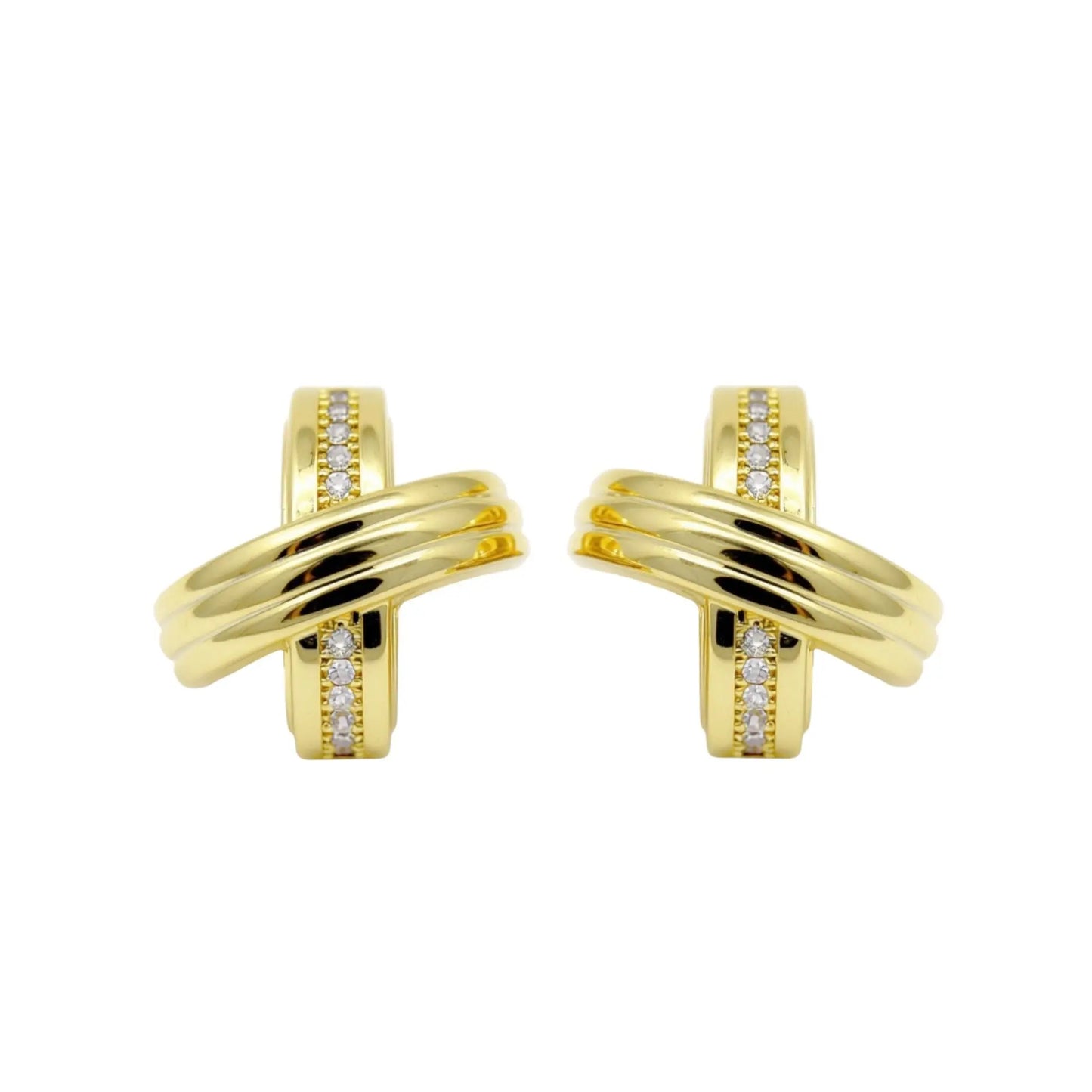Onze goudkleuirge cross design clipsen zijn bezet met gefacetteerde zirkonia stenen. Afmeting 1.9 x 1.8 mm., totaal gewicht 7.8 gram.
