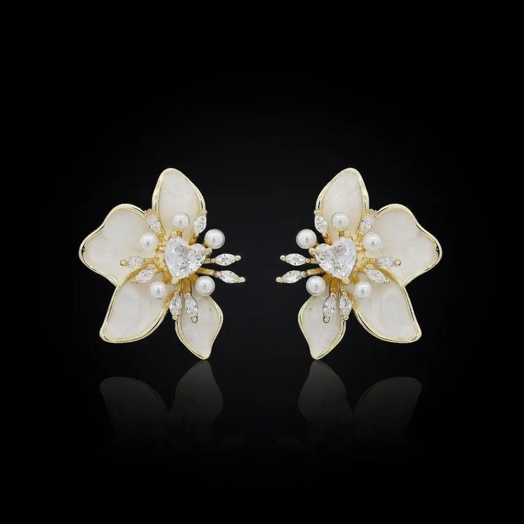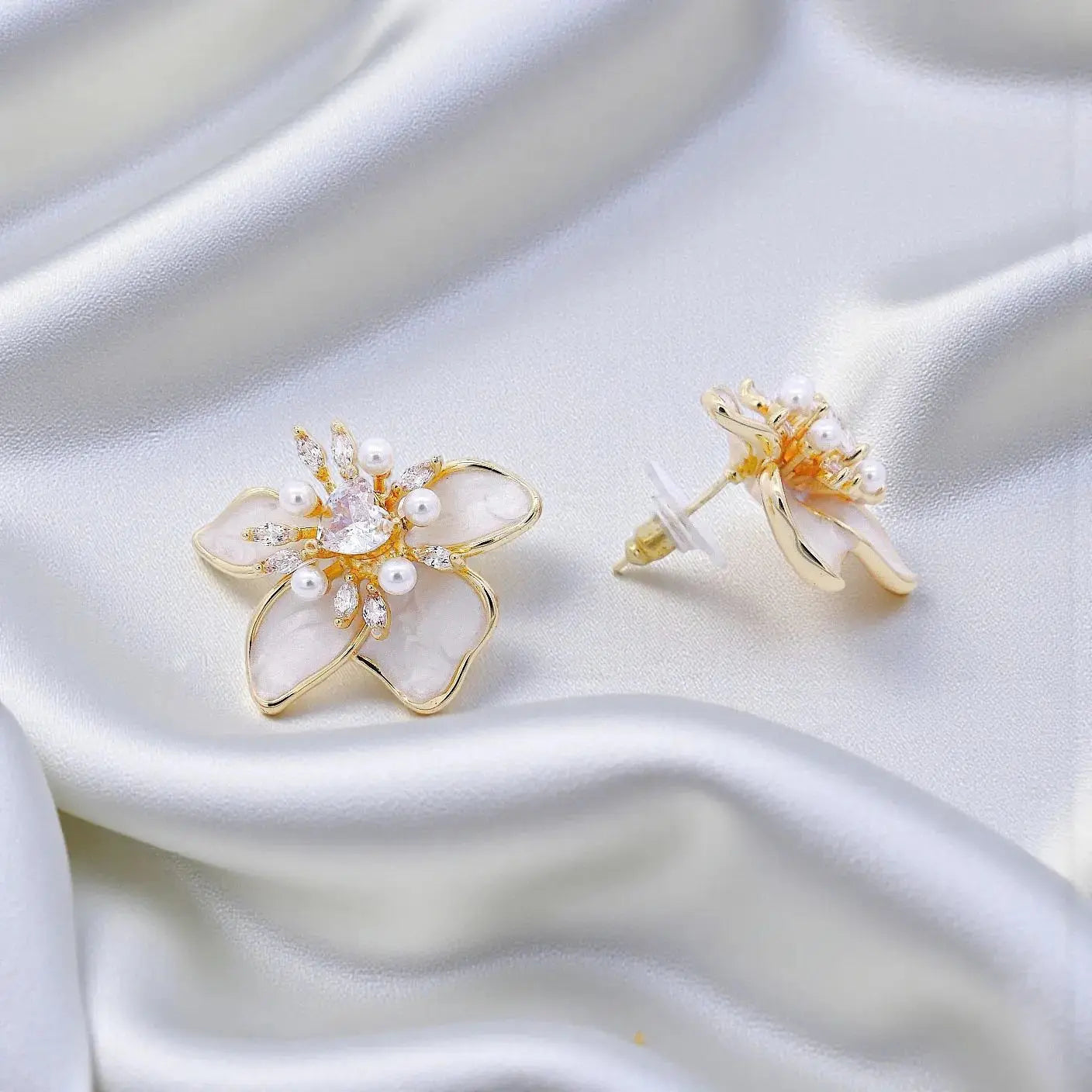 Goudkleurige Magnolia Oorbellen met Parels, Emaille en Zirkonia