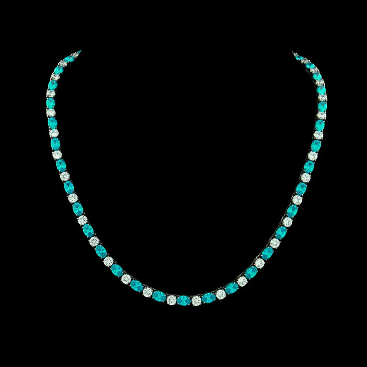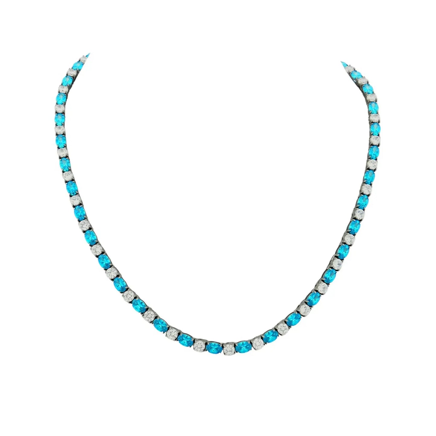 Deze RVS tenniscollier is om en om bezet met ovaal geslepen blauwe, topaaskleurige gefacetteerde zirkonia's en met rond geslepen gefacetteerde witte zirkonia's. Aan het uiteinde een drukslot. De breedte is 4 mm., lengte 45 cm. Totaal gewicht 31.9 gram.