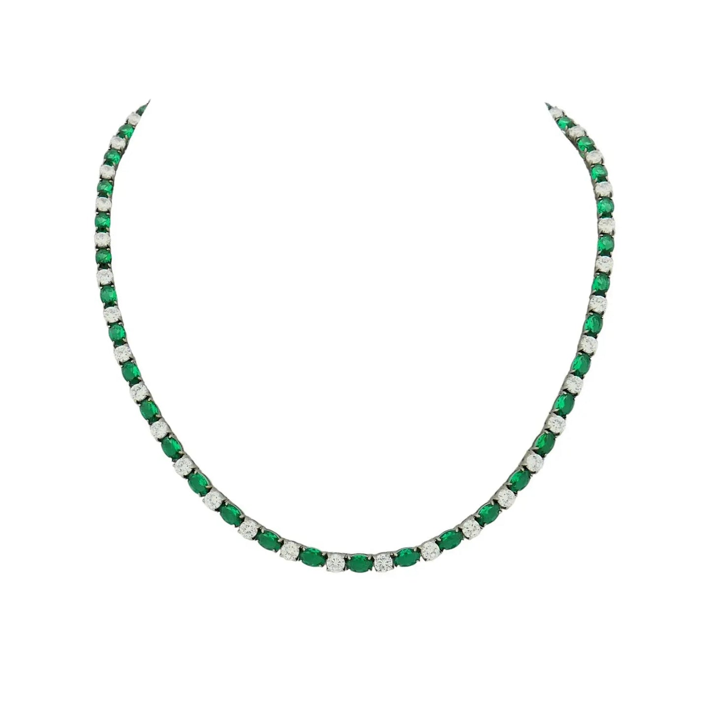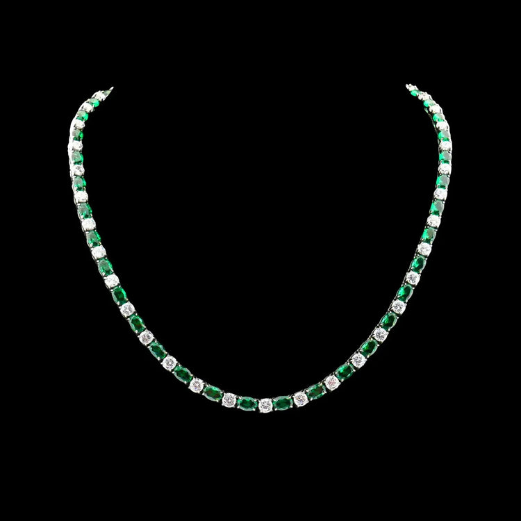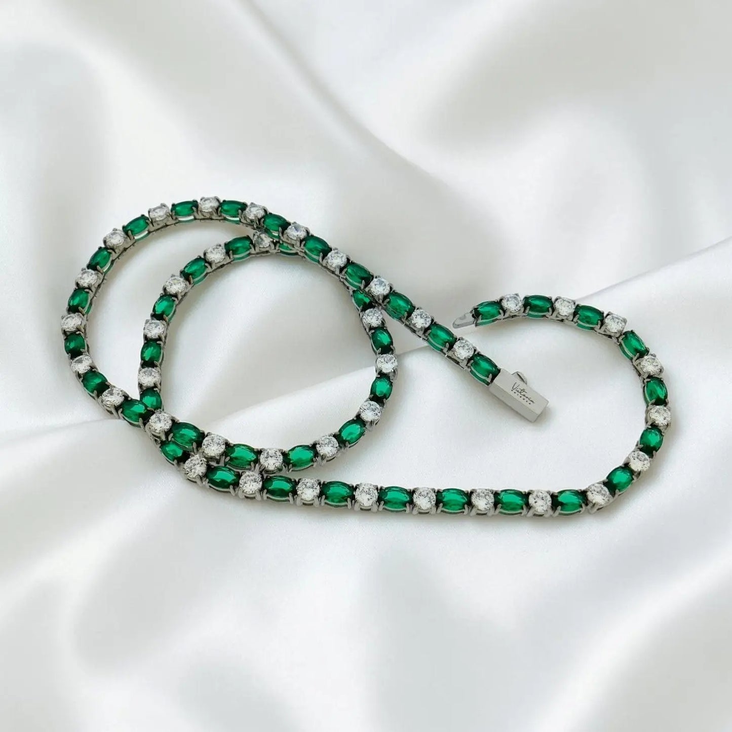 Deze RVS tenniscollier is om en om bezet met ovaal geslepen groene, smaragdkleurige gefacetteerde zirkonia's en met rond geslepen gefacetteerde witte zirkonia's. Aan het uiteinde een drukslot. De breedte is 4 mm., lengte 45 cm. Totaal gewicht 28.6 gram.