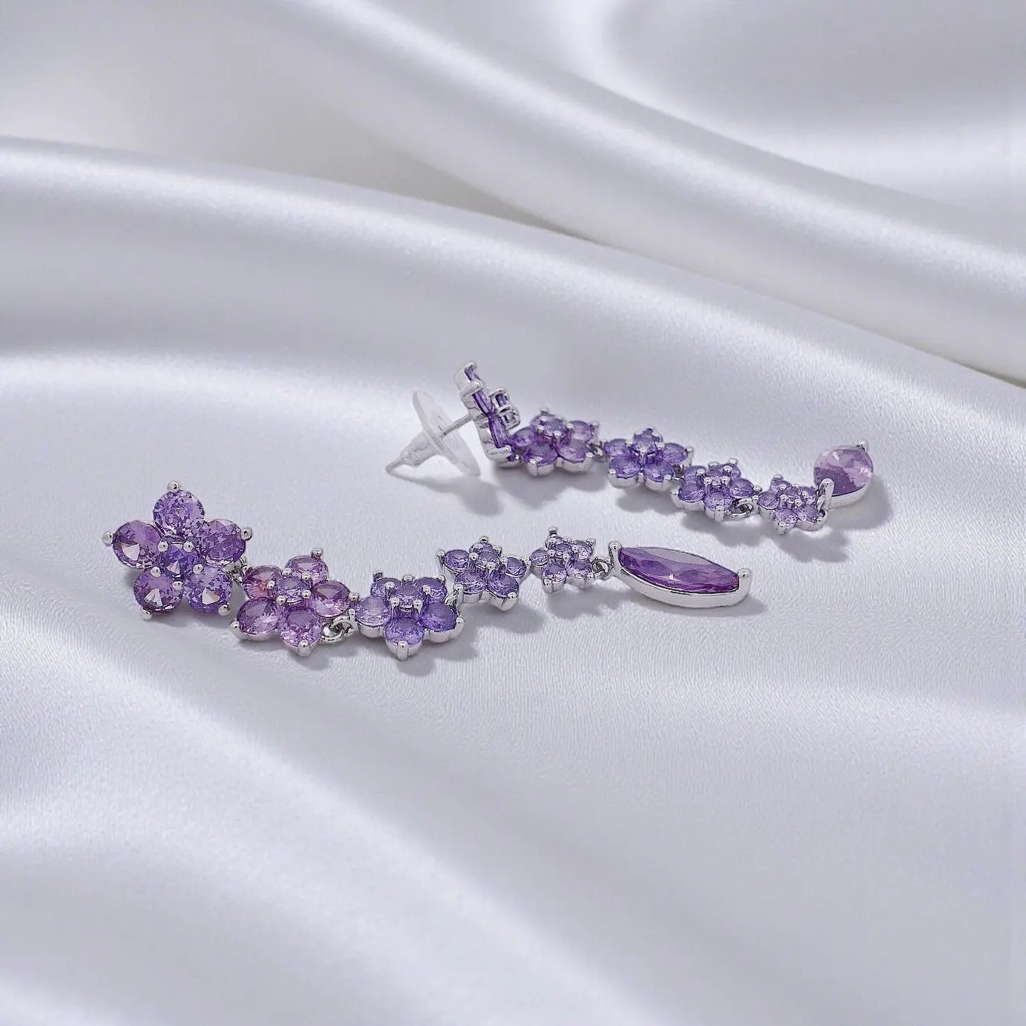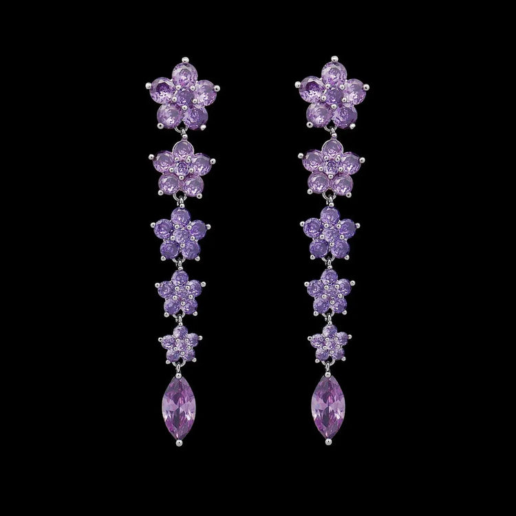 Zilverkleurige avondbloem oorbellen met paarse zirkonia stenen