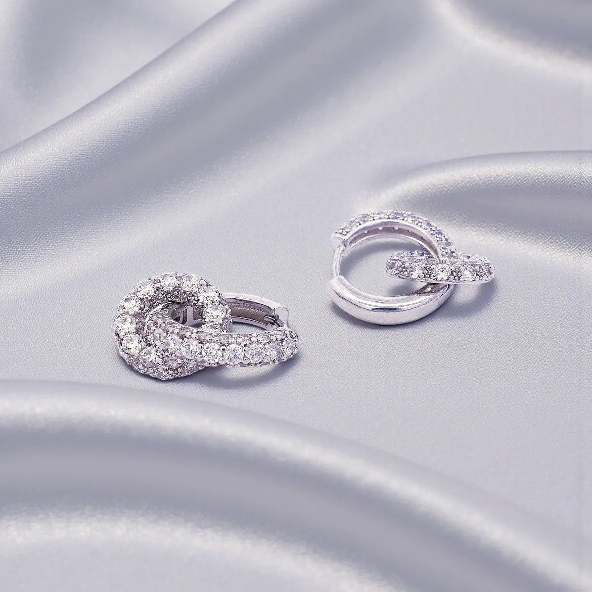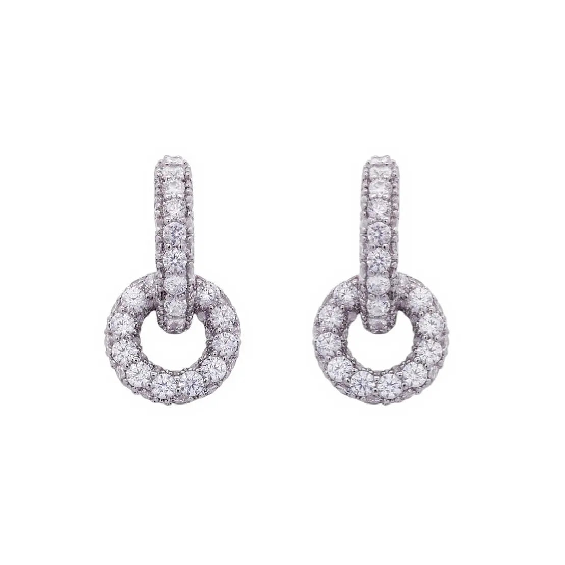 Deze zilverkleurige oorbellen zijn vervaardigd van messing en bestaan uit creolen bezet met gefacetteerde zirkonia's waaraan afneembaar te dragen cirkelvormige ornamenten bezet met zirkonia's. Afmeting 2.5 x 1.4 cm., totaal gewicht 7 gram.