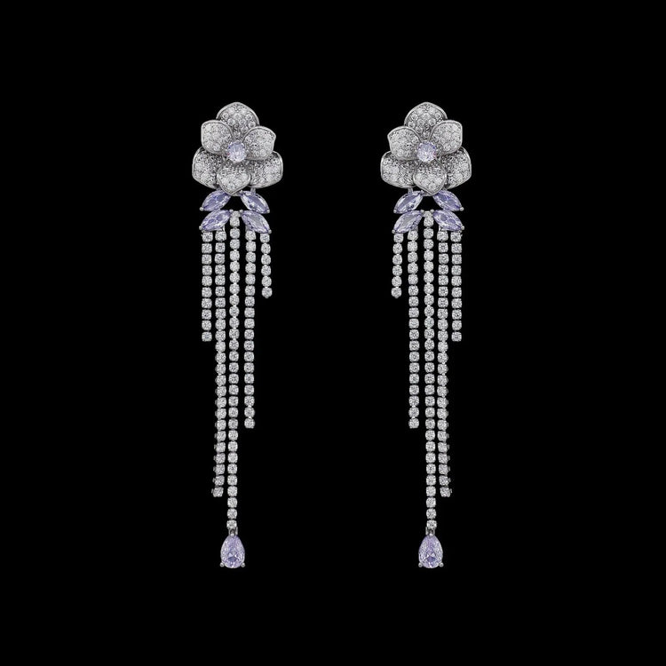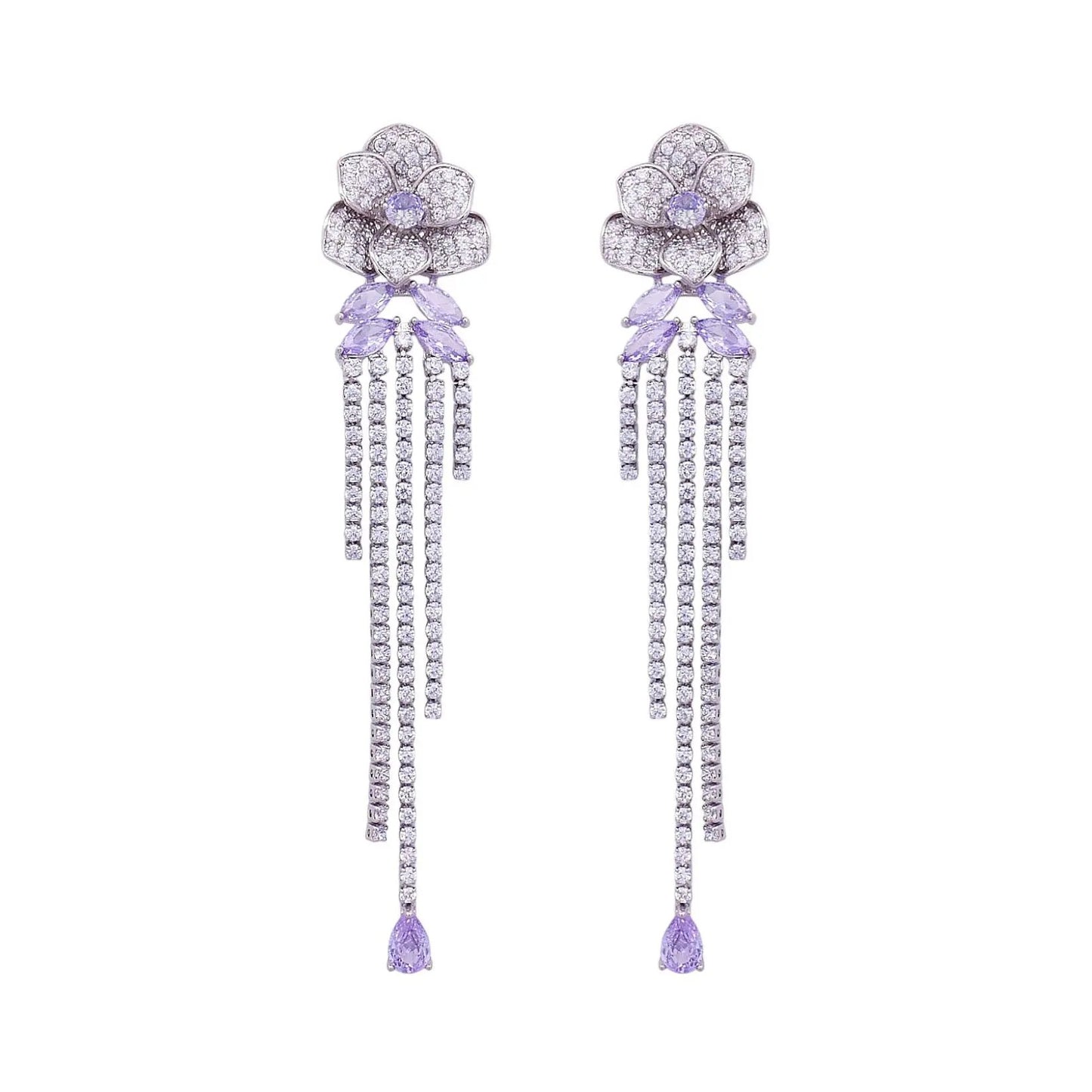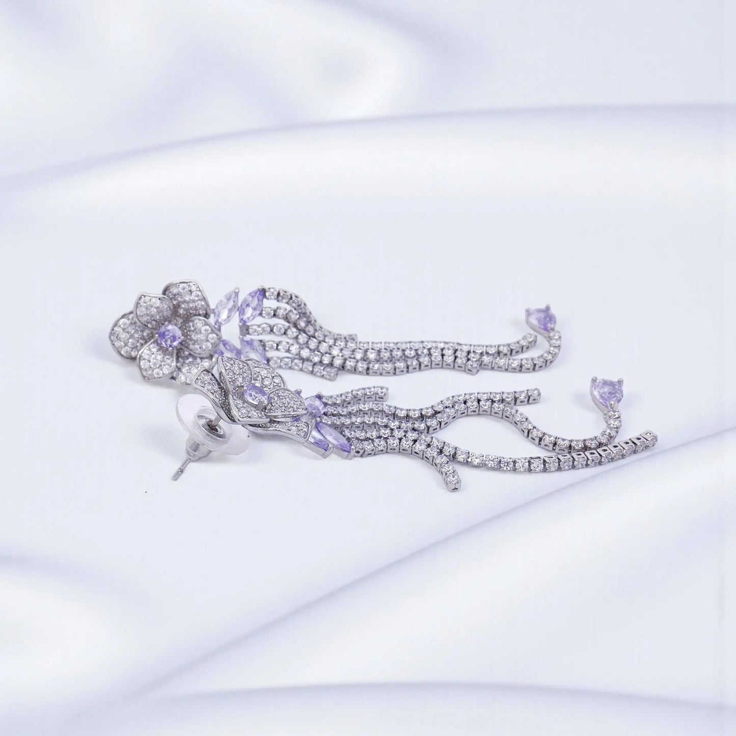 Zilverkleurige lange bloem oorbellen met paarse zirkonia stenen