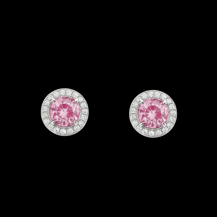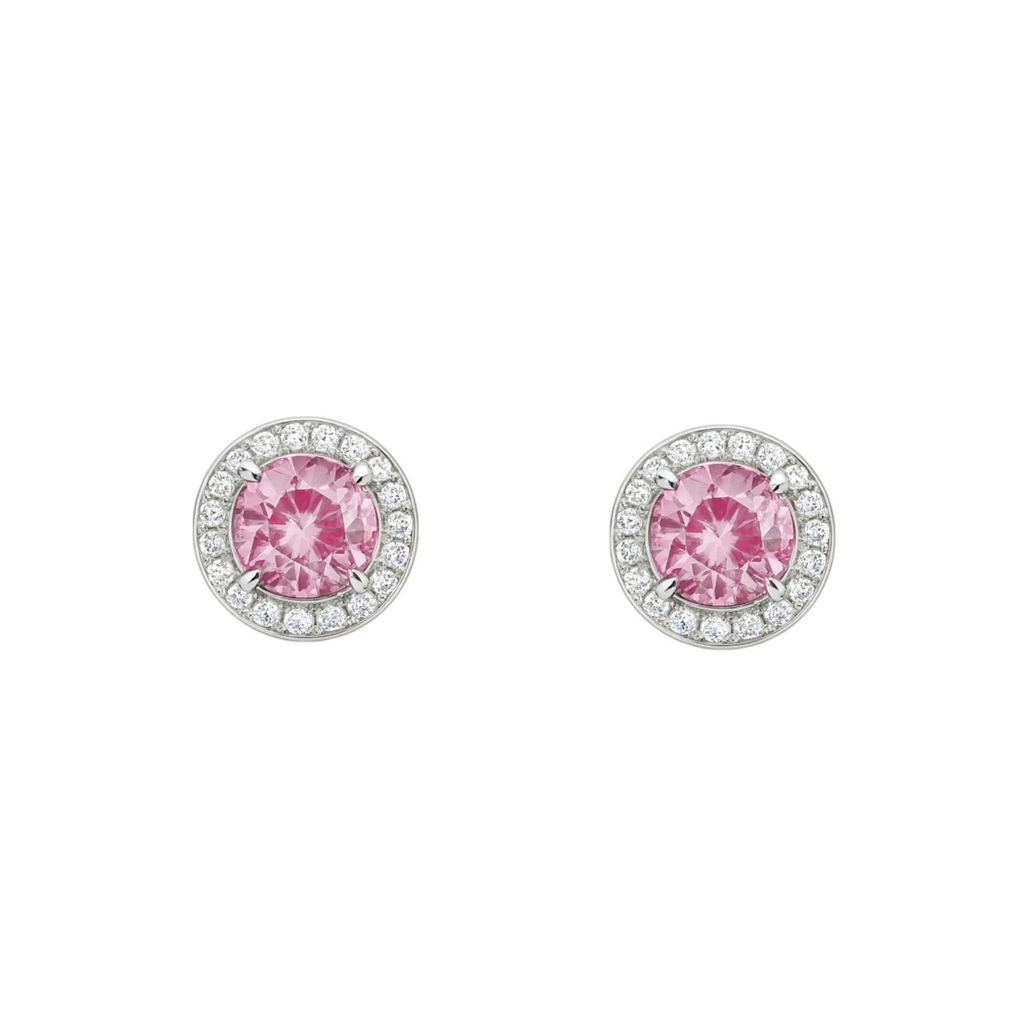 Deze entourage oorknoppen zijn bezet met rond geslepen gefacetteerde roze zirkonia stenen waaromheen een rand van kleine witte gefacetteerde zirkonia's. De stiften zijn vervaardigd van 925 zilver. Doorsnede 1.1 cm., totaal gewicht 2.6 gram.