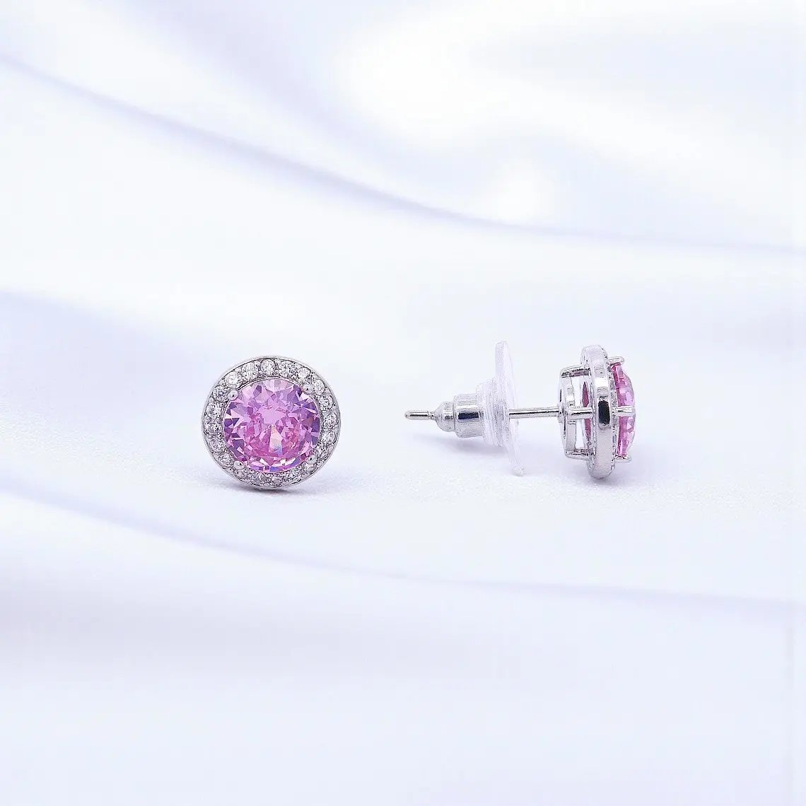 Zilverkleurige ronde roze entourage oorbellen met zirkonia stenen
