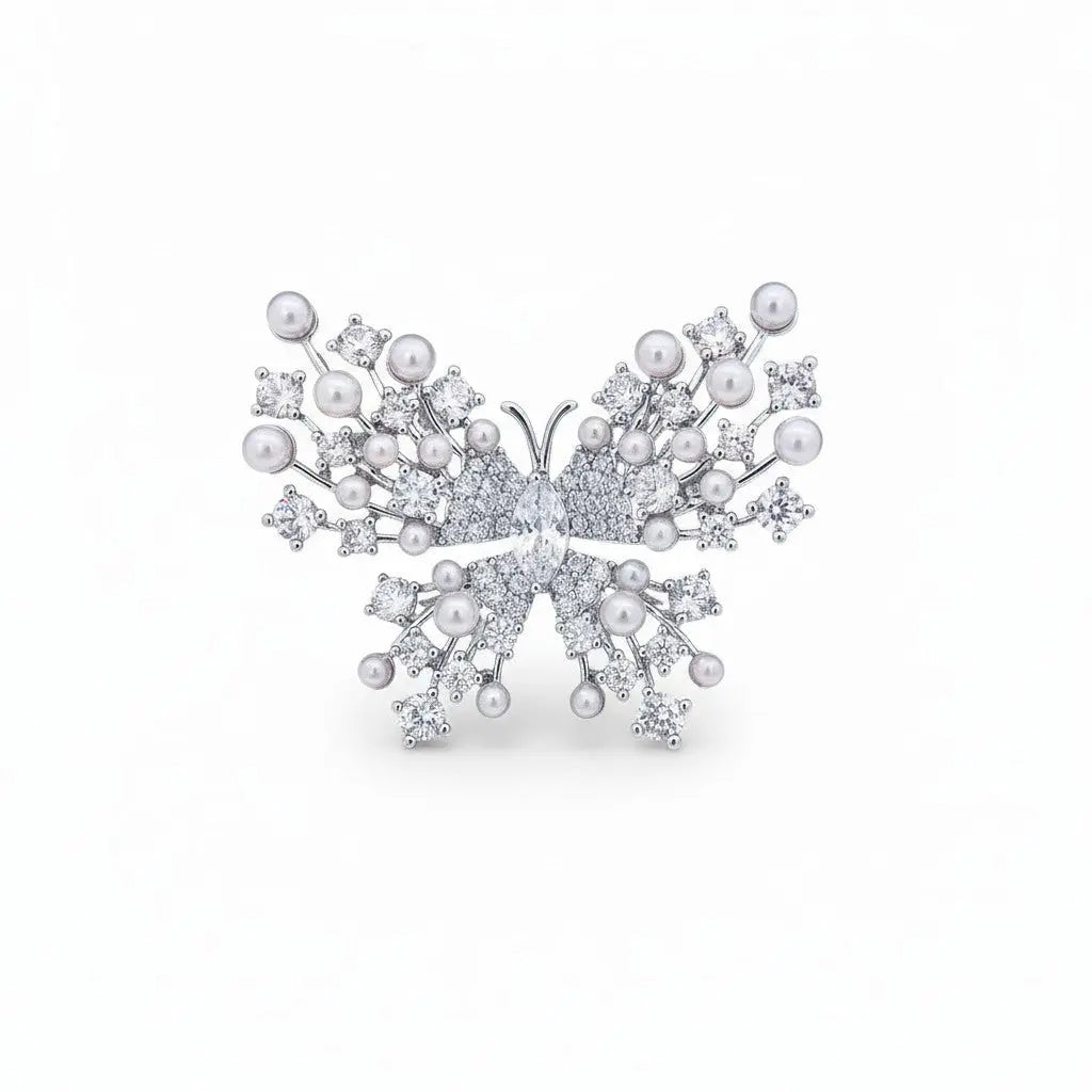 Zilverkleurige Vlinder Broche met Parels en Zirkonia Stenen