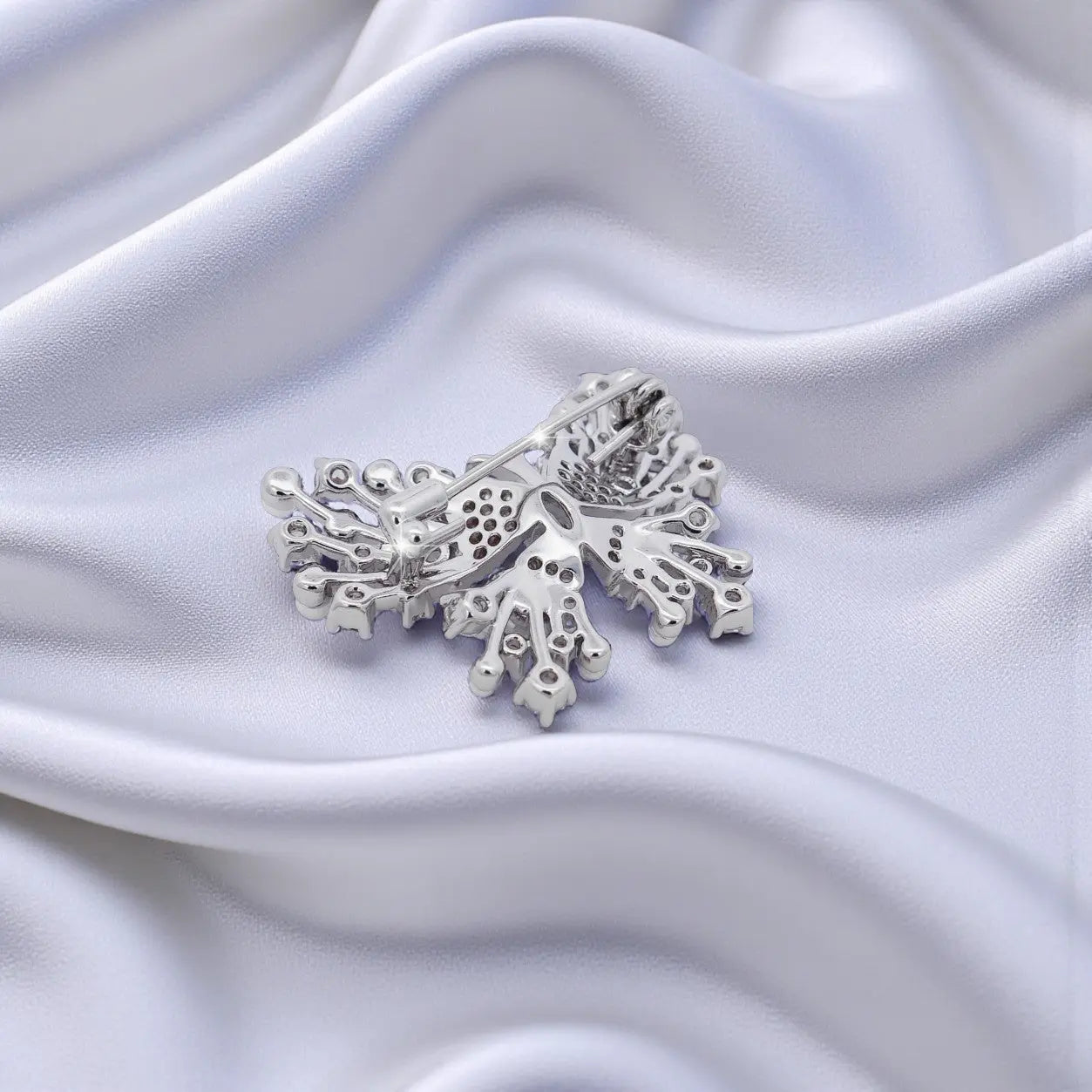 De vlinderbroche heeft een elegante en verfijnde vorm met een subtiele glans. De combinatie van zilverkleurig metaal, parels en zirkonia stenen zorgt voor een sierlijk accent dat de outfit compleet maakt. Het ontwerp straalt een zachte, vrouwelijke uitstraling uit zonder te overheersen.