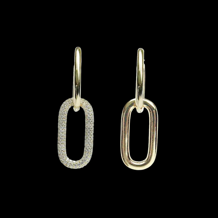 Deze goudkleurige link oorbellen bestaan uit ovale creolen waaronder afneembaar te dragen ovale aanhangers aan de voorkant pavé bezet met zirkonia's. De oorbellen hebben een afmeting van 4.3 x 1.4 cm. Goudkleurige oorbellen zijn een essentiële toevoeging aan je sieradencollectie, en deze oorbellen met zirkonia's voegen een stralend detail toe aan elke outfit. De combinatie van goudkleur en de glinsterende zirkonia's zorgt voor een luxueuze uitstraling, perfect voor zowel dagelijkse draagbaarheid als speciale gelegenheden.