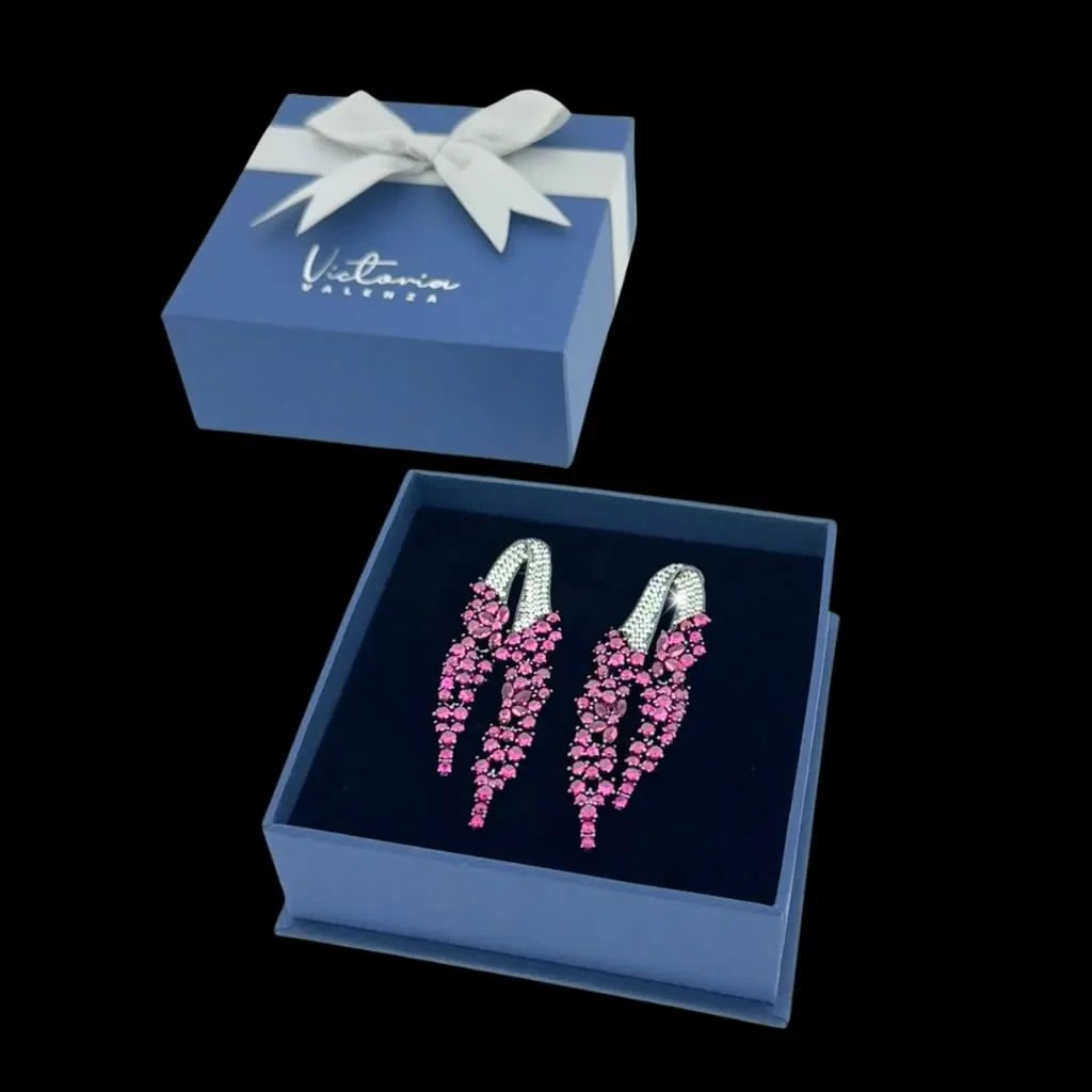 Deze oorbellen zijn pavé bezet met vele witte gefacetteerde zirkonia's waaronder 2 hangende ornamenten bezet met verschillende slijvormen donkerroze zirkonia's. de stiften zijn vervaardigd van 925 zilver. Afmeting: 7.5 x 2.2 cm.