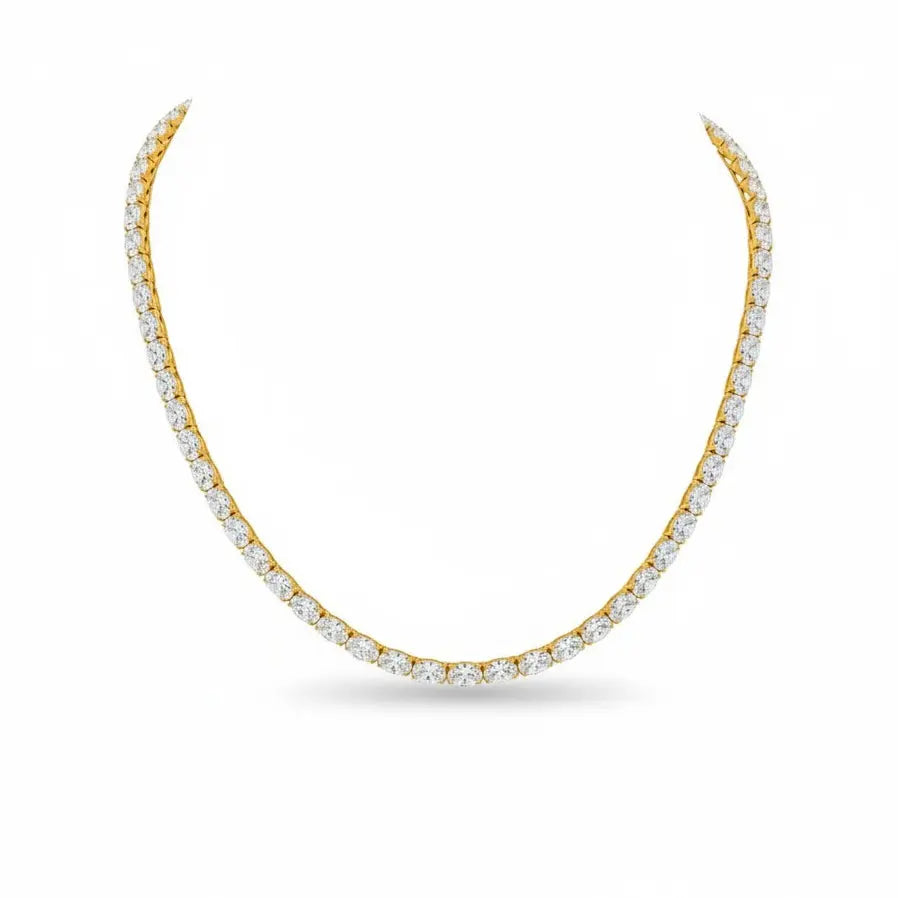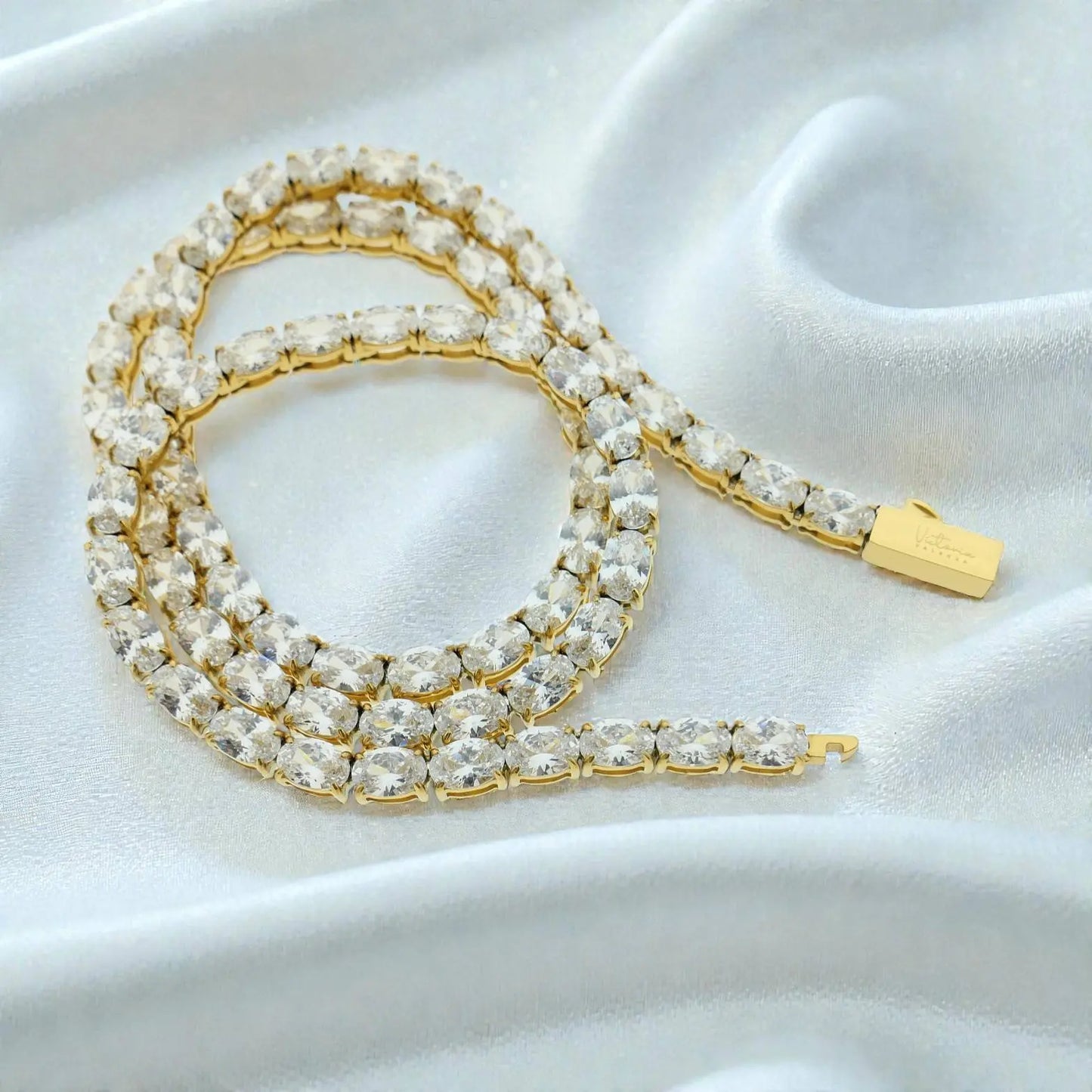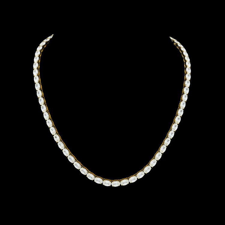 Dit goudkleurig RVS tenniscollier is bezet met ovaal geslepen gefacetteerde zirkonia's. Aan het uiteinde een drukslot. De breedte is 4 mm., lengte 45 cm. Totaal gewicht 26.7 gram.
