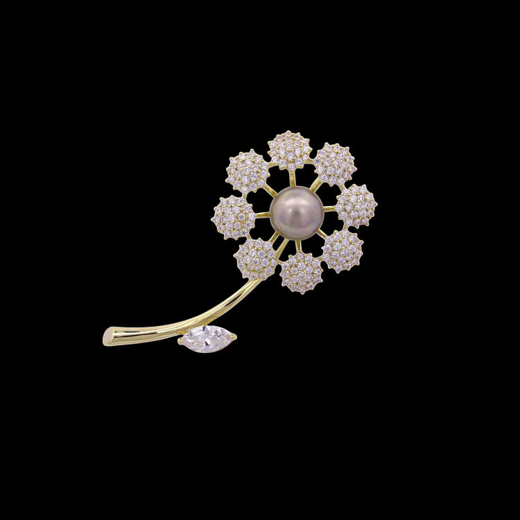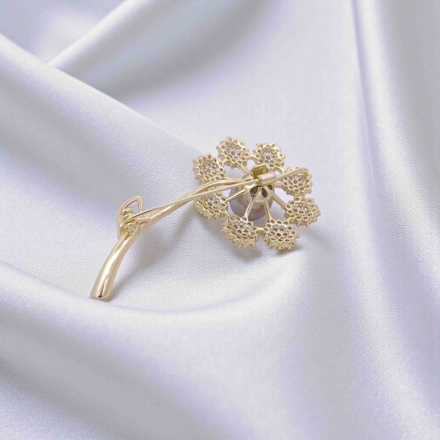 Broche et pendentif en forme de fleur couleur or, ornés d'une perle grise et de pierres de zircone.