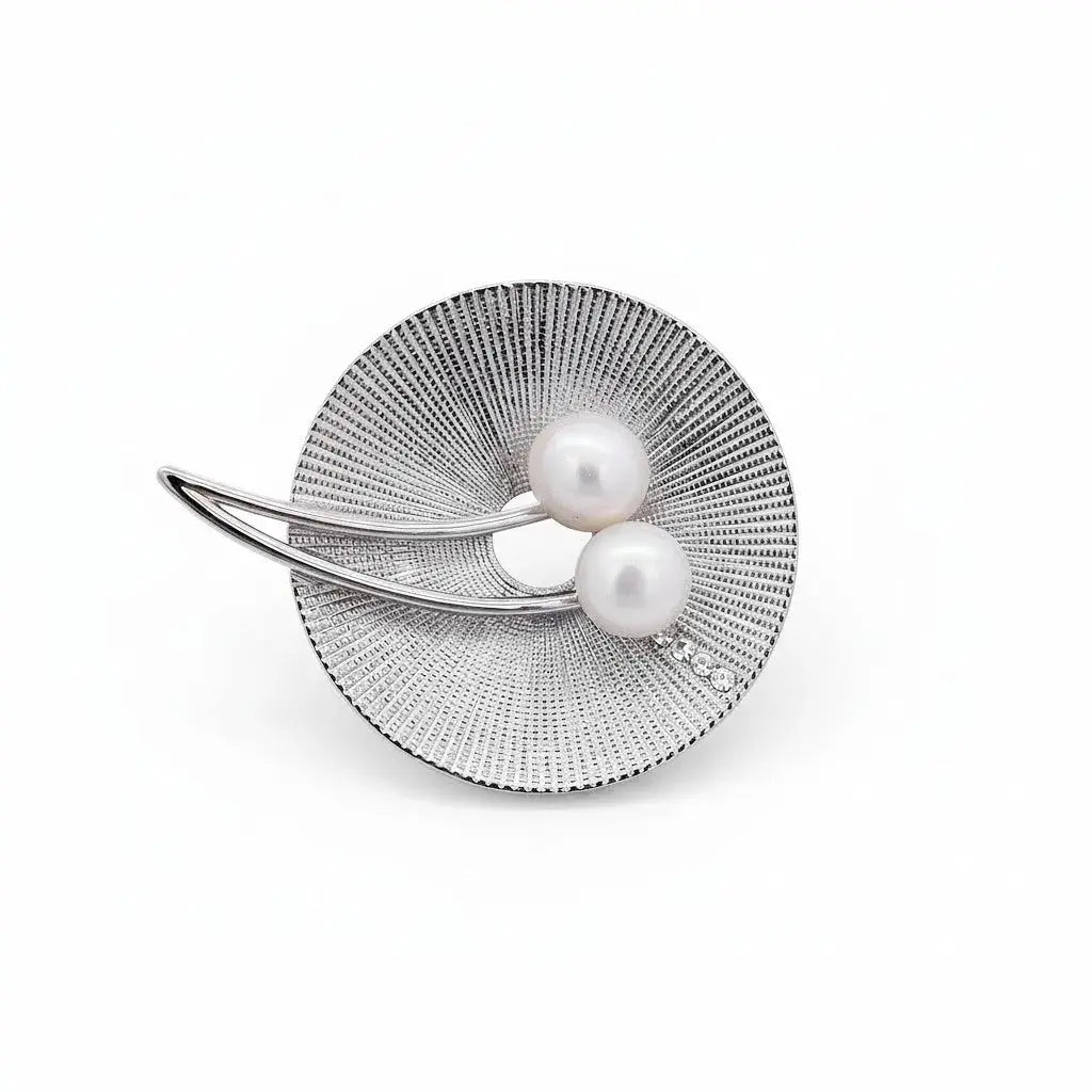 Broche Disque Argentée avec Perles d'Eau Douce et Pierres en Zirconium