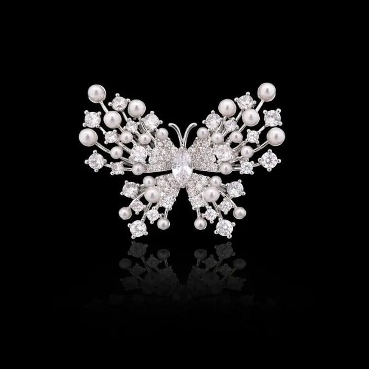 Broche Papillon Argentée avec Perles et Pierres en Oxyde de Zirconium