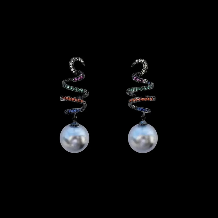 Slinger oorbellen met multicolor zirkonia's en grijze parels