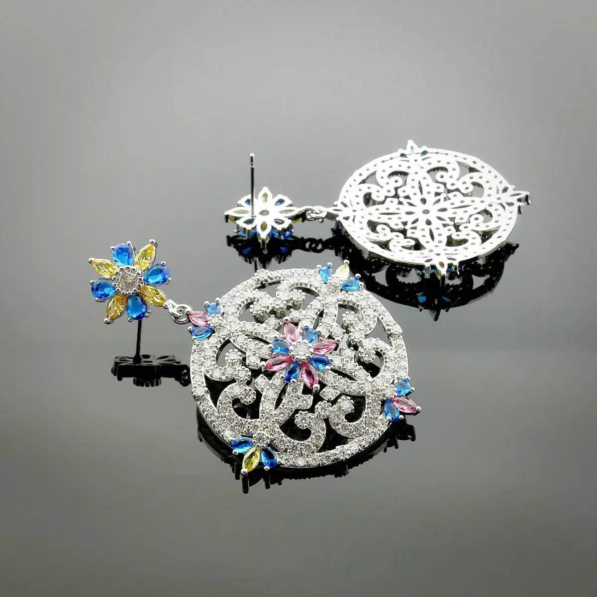 Deze zilverkleurige mandalapatroon oorbellen met multicolor zirkonia's zijn bezet met markies en peervormige gele, blauwe en roze zirkonia's en met kleine witte gefacetteerde zirkonia's. Afmeting: 5.3 x 3.6 cm.