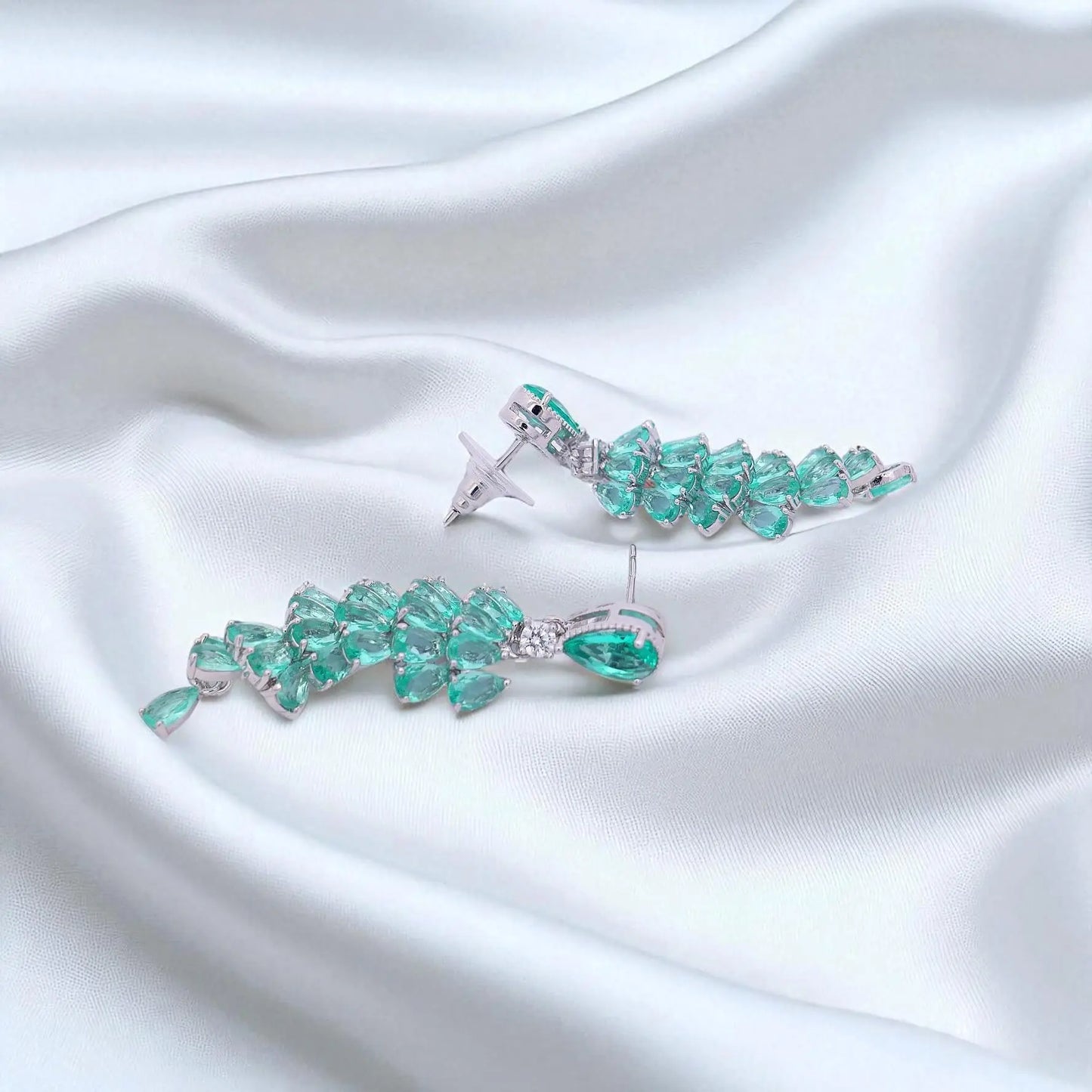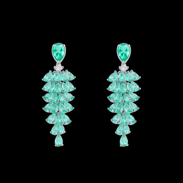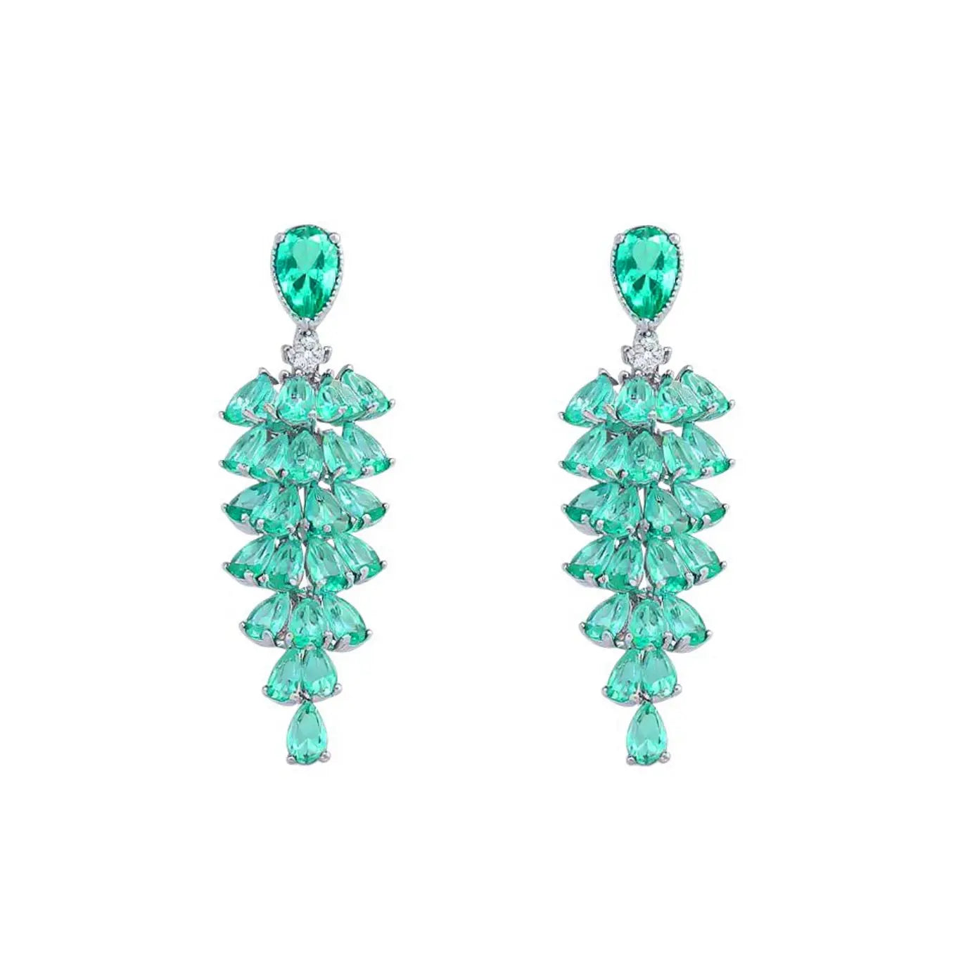 Deze zilverkleurige tros oorbellen zijn bezet met peervormig geslepen groene zirkonia's en met rond geslepen gefacetteerde witte zirkonia's. De stiften van vervaardigd van 925 zilver. Afmeting 5 x 1.4 cm., totaal gewicht 7.4 gram.