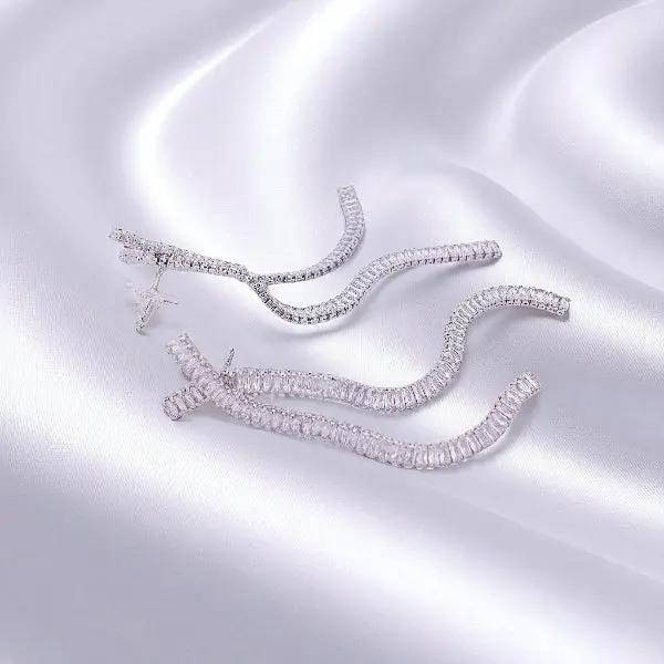 Deze zilverkleurige Y-vorm oorbellen zijn bezet met baquette geslepen zirkonia's. De stiften zijn vervaardigd van 925 zilver. Afmeting 8.6 x 1.5 cm., gewicht 9.6 gram.